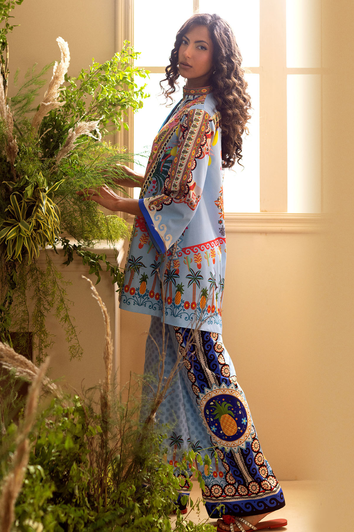 Co-ordinating set crafted from crepe silk, adorned with whimsical floral printed details. This ensemble includes a knee-length shirt characterized by a loose silhouette, embellished with floral and fauna printed accents. The shirt is elegantly paired with loose-fitting coordinating trousers.