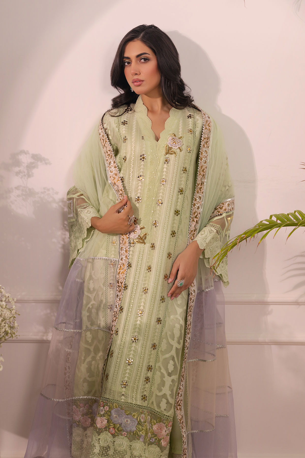 To create a complete ensemble, this shirt pairs beautifully with the signature AA izaar, which showcases schiffli and embossed organza details, providing a cohesive and stylish look. For the finishing touch, consider adding a color-blocked net dupatta with hand-block printed borders, which complements the outfit and elevates it for any occasion
