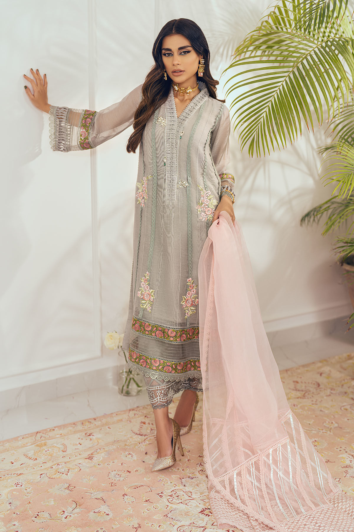 Long silhouette silk net shirt on subtle grey canvas featuring pleats and pin tucks details which are adorned with embroidered panels on hemline and silk thread rosettes in pastel shades. The fabric manipulated neckline is enhanced with handcrafted embellishments and the outfit can be paired with soft pink organza dupatta featuring embossed organza and lace details incorporated with gota. The shirt can be paired with matching izaar featuring schiffli and pleats on hem.