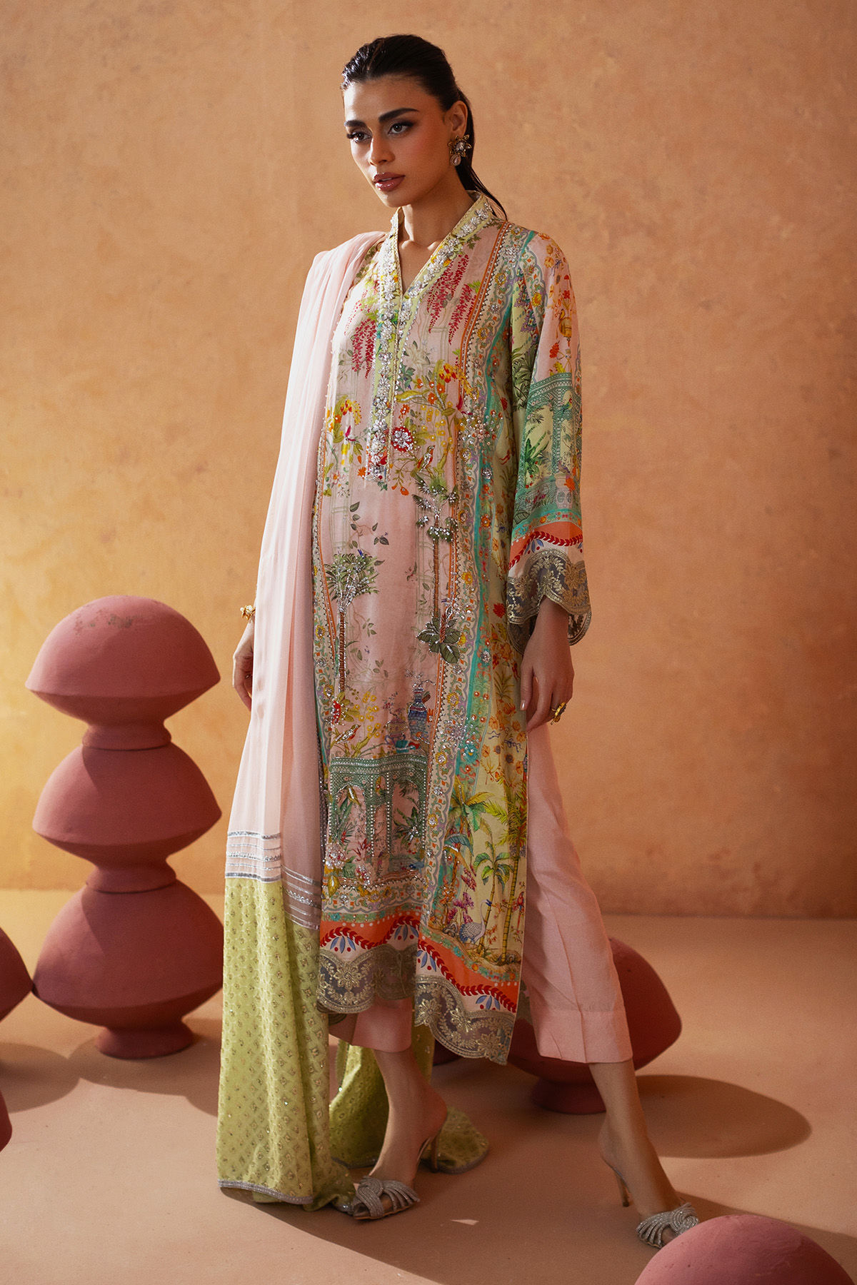 An A-line shirt crafted from silk canvas, presented in an exquisite combination of blossom pink and mint green, showcases intricate silver hand-embroidered details at the center front and an overlapping neckline. The hem of the shirt is perfectly adorned with an appliqué featuring a zari embroidered border. This ensemble can be elegantly paired with a designer dupatta, which includes light-catching sequins panels on each pallu, embellished with gota accents. The outfit is complemented by matching straight pants, ensuring a sophisticated appearance for the festive season.