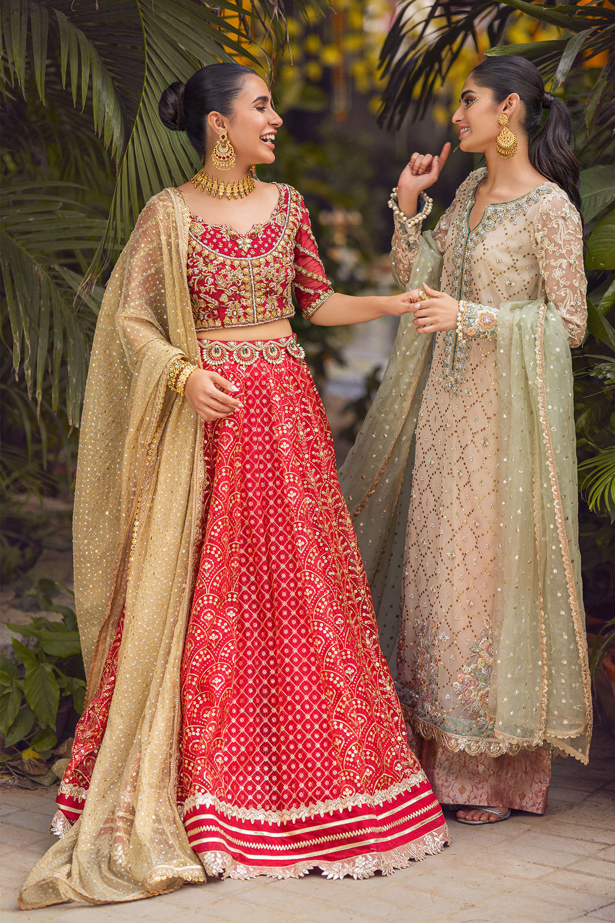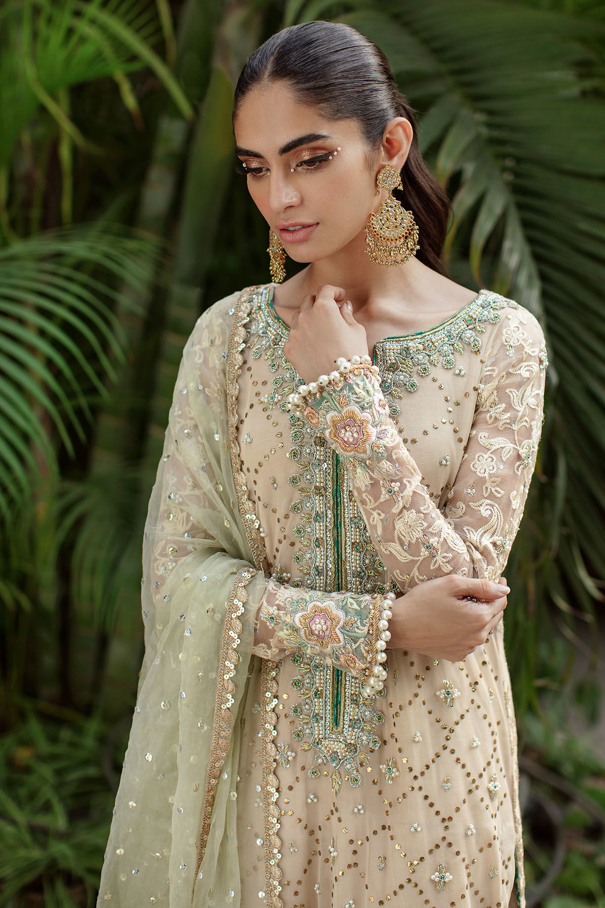 Long silhouette shirt on net canvas in subtle beige shade featuring gold kaamdani details on centre front. The neckline is adorned with heavy zardozi details featuring pearls and light catching crystals, dabka and nakshi. The outfit is paired with mint organza contrasting dupatta and ombre flared pants in pure damask.