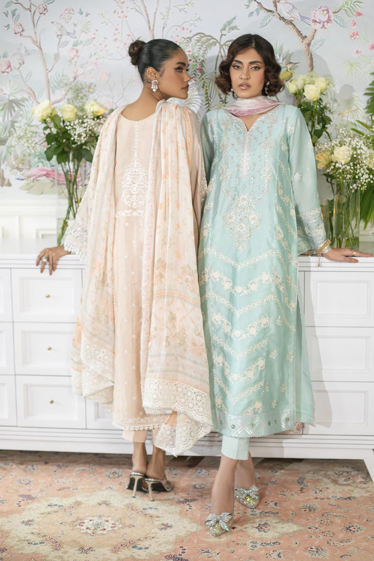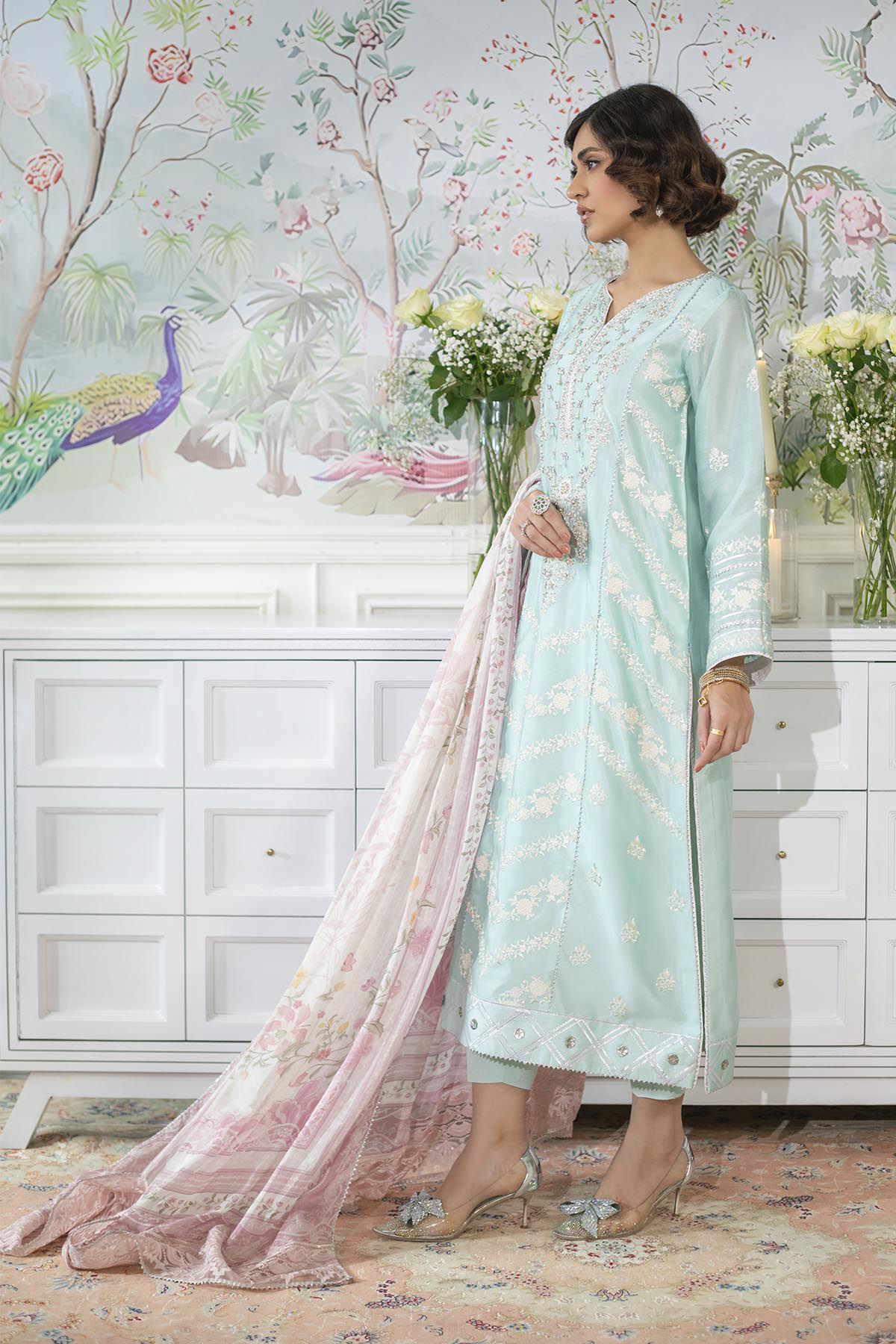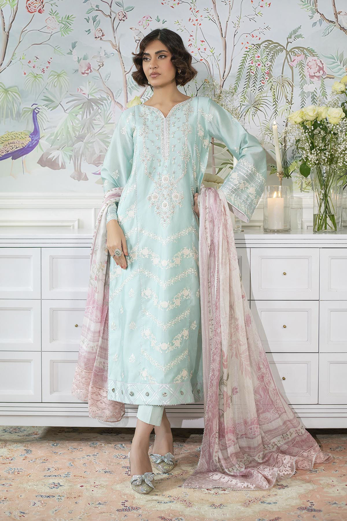 Long silhouette shirt in a stunning ice blue hue crafted from pure silk canvas, embellished with delicate silk thread embroidery. The embroidered details are further enhanced with zardozi and pearls. This ensemble includes complimentary straight pants and a digitally printed silk dupatta adorned with subtle floral motifs in exquisite shades of pink and peach.