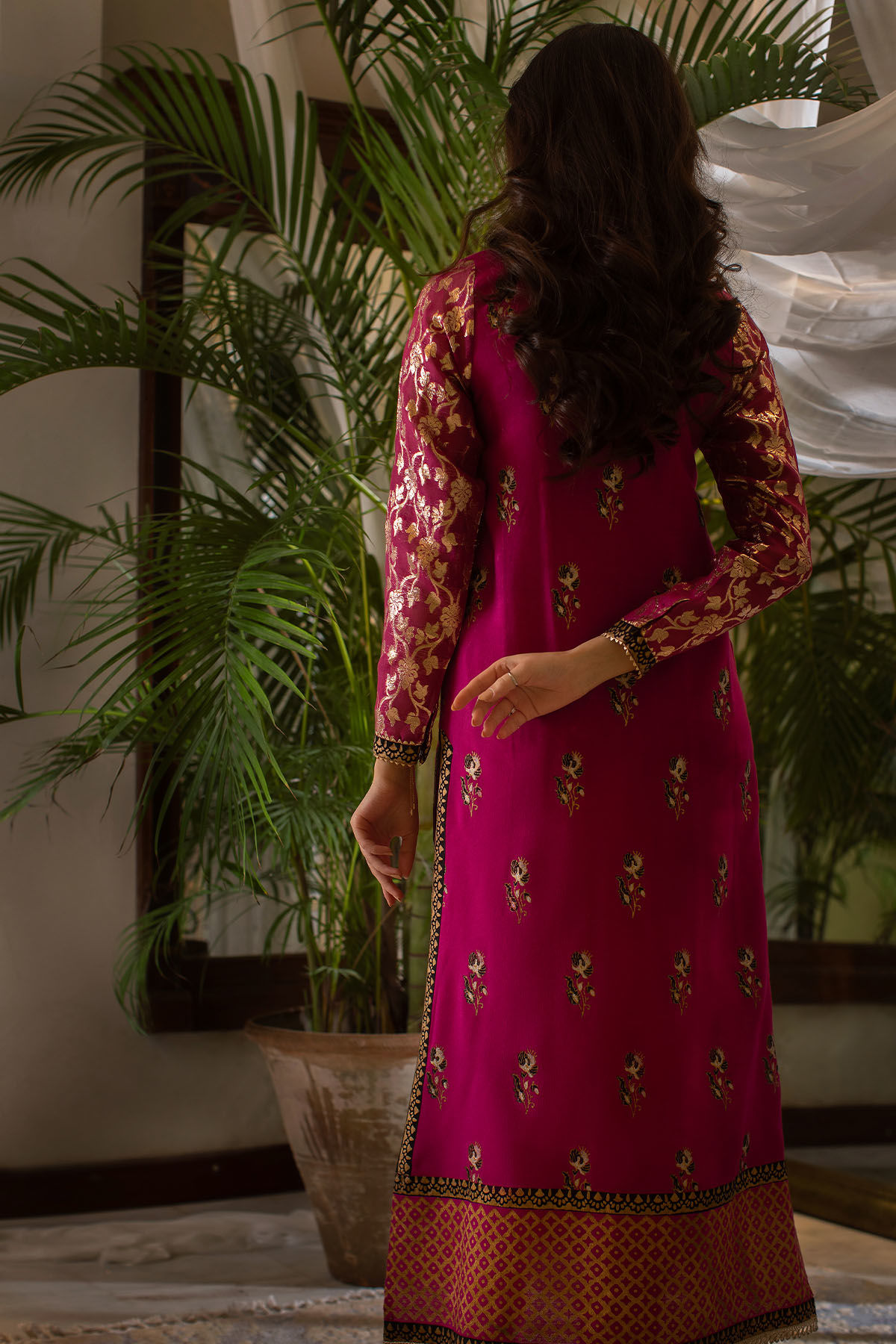 Long silhouette cotton net angharka feather gota details and hand block printed hemline. The hemline and side slits are enhanced with black contrasting panel featuring gold hand block printed details. The lorex sleeves are sure to make it look more festive. The angharka is enhanced with handcrafted gota tassels and can be paired with matching straight pants with festive lace and gota edging.
