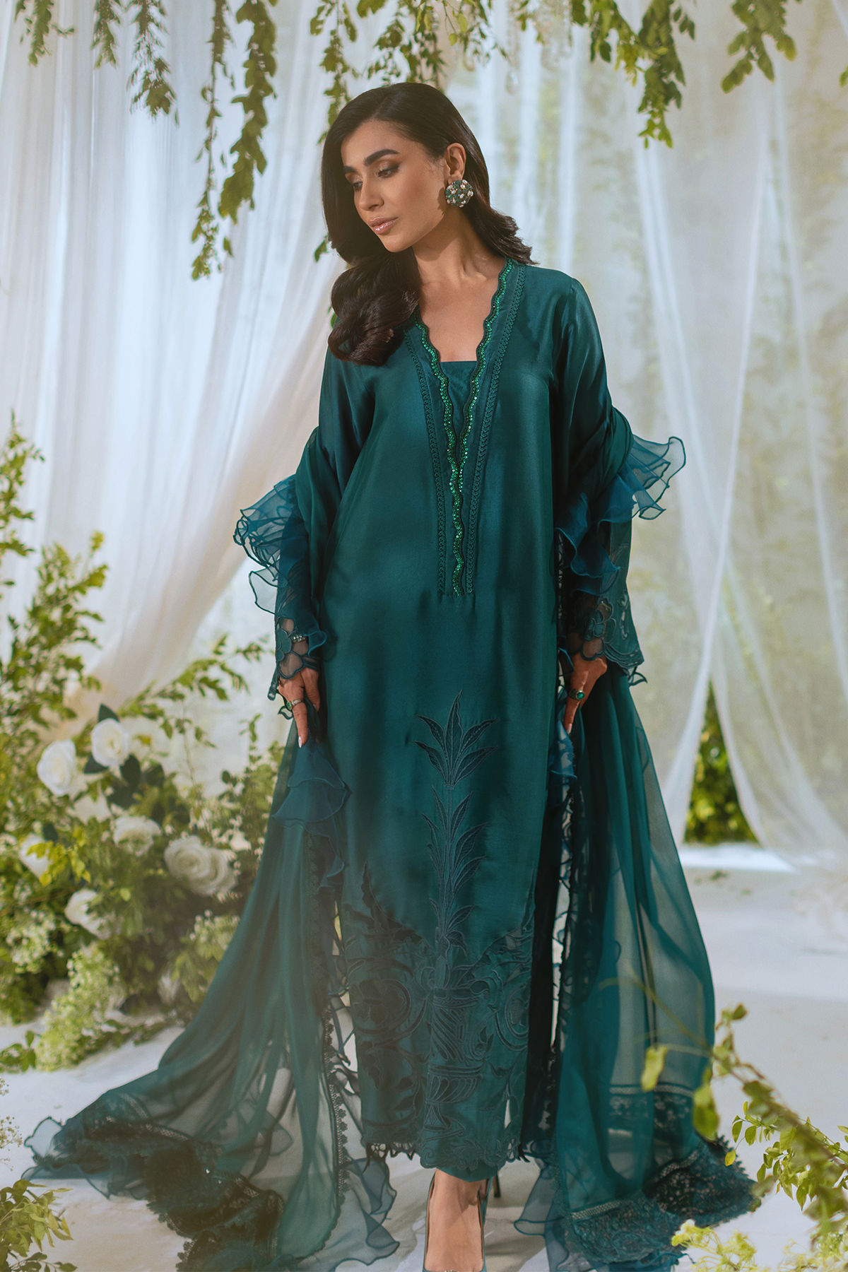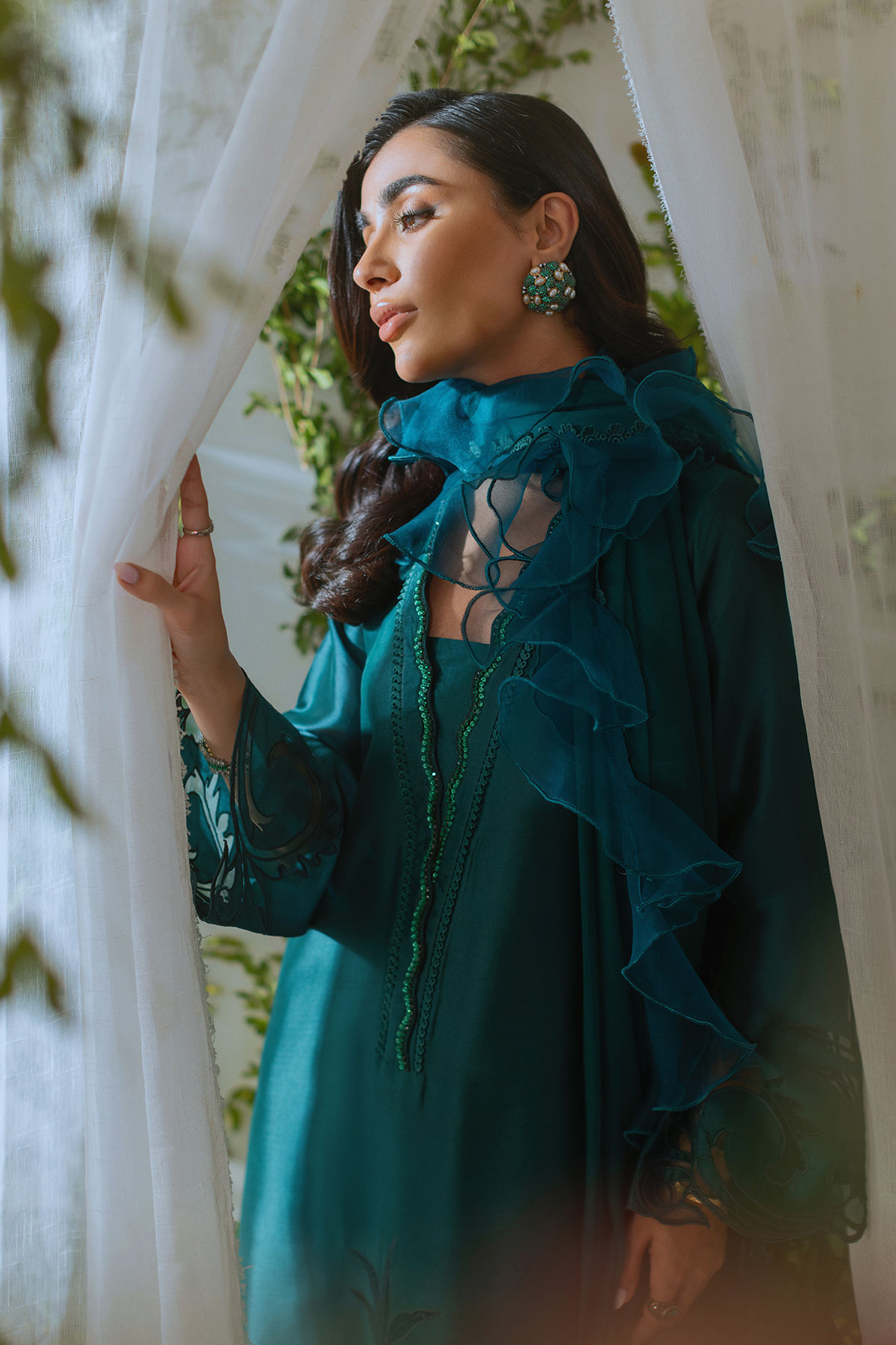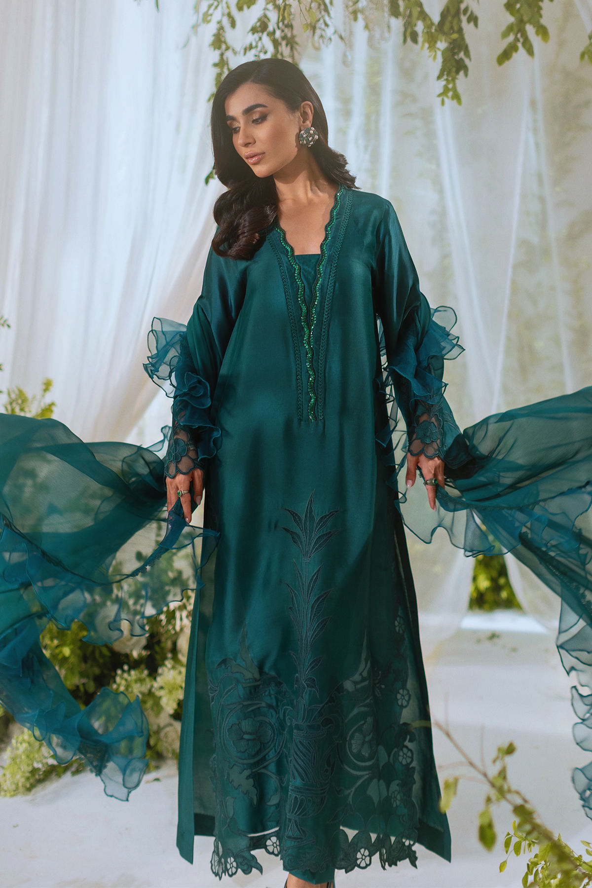 Long silhouette shirt in stunning emerald green on silk canvas featuring reverse appliqué details on hemline and side slits. The neckline is enhanced with tone on tone light catching crystal details. The outfit is paired with signature AA dupatta and matching raw silk pants to turn heads this festive season.