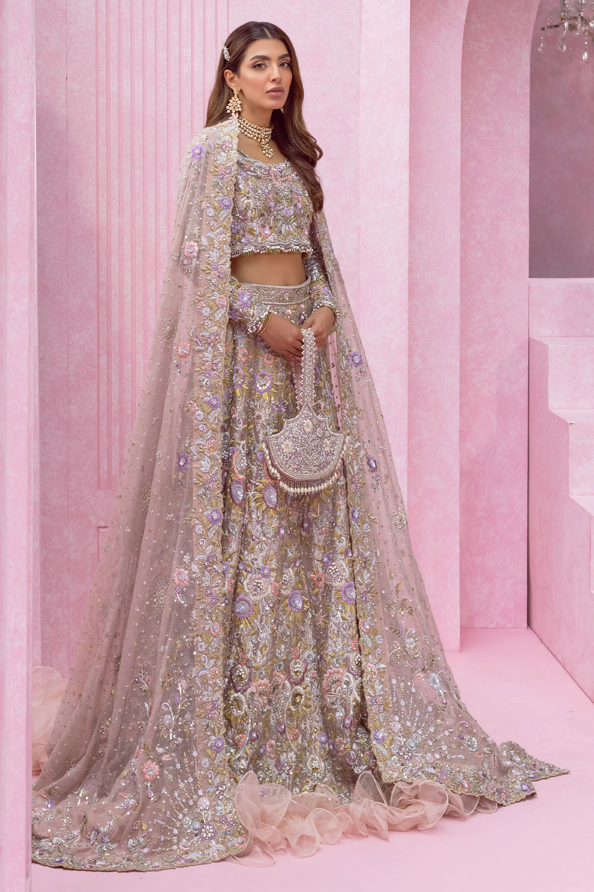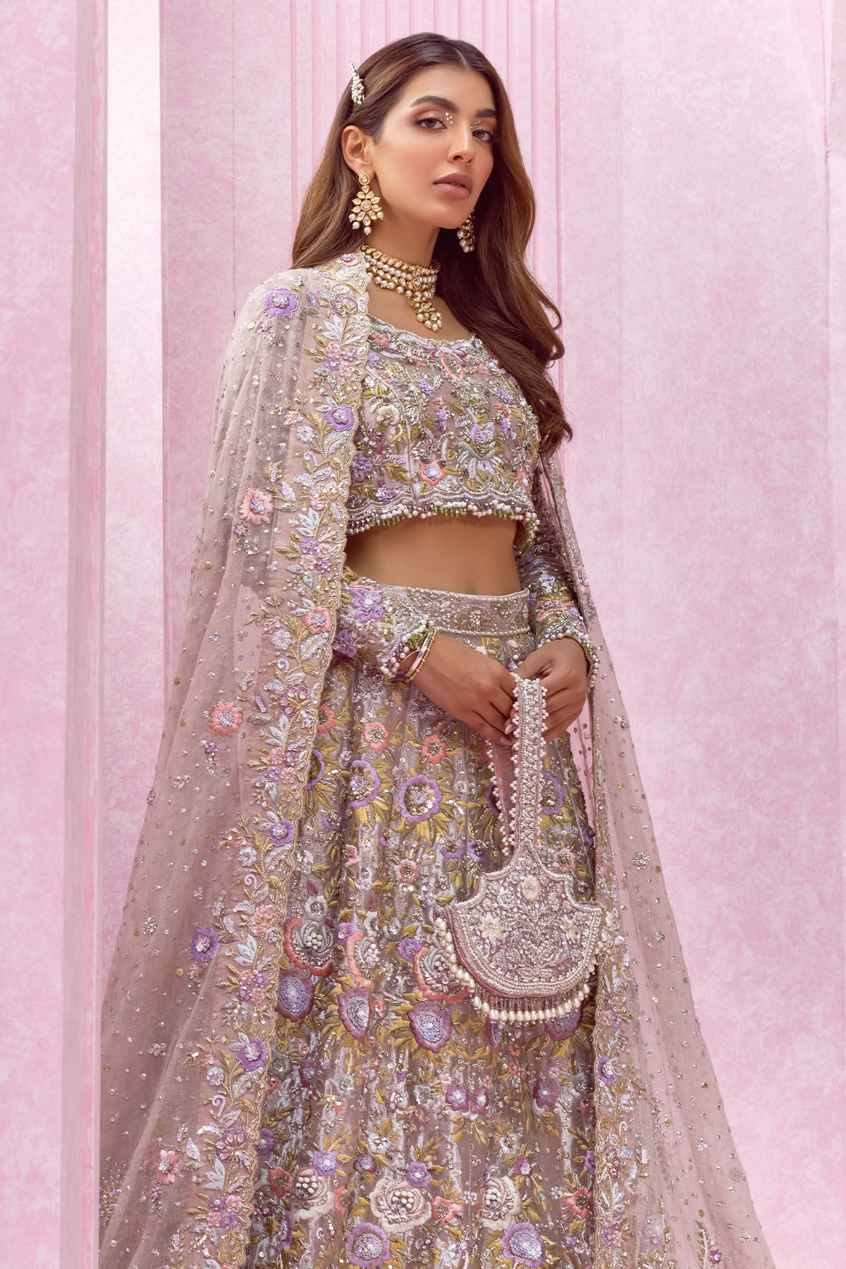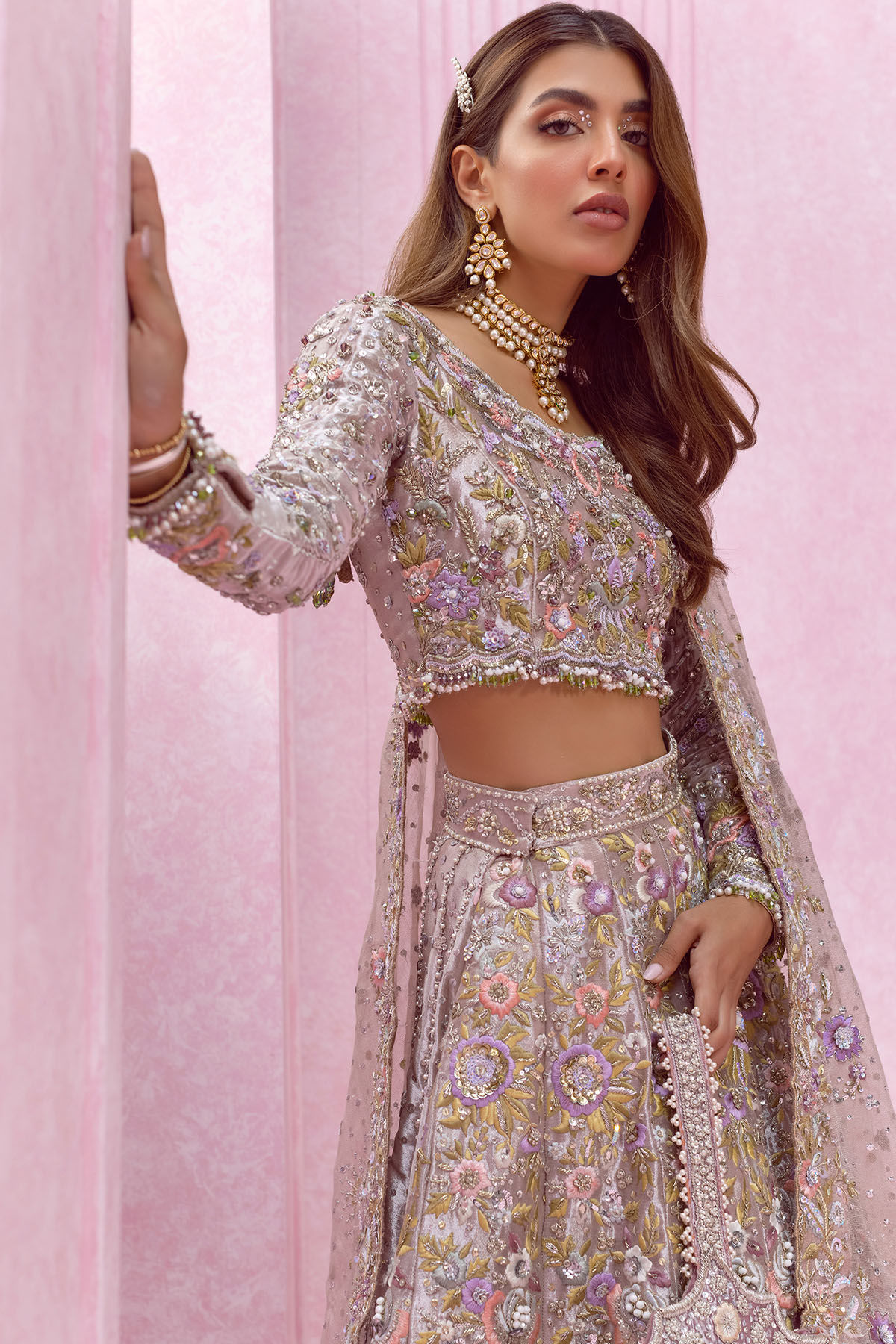 Nude gold lame canvas adorned with intricate zardozi details featuring sequins, zardozi and single dhaga resham details. The head turning lehnga is adorned with symmetrical floral patterns in subtle pastel shades which is further decorated with zardozi and crystals. The net dupatta is enhanced with resham embroidery details along with pearls, zardozi and sequins details.