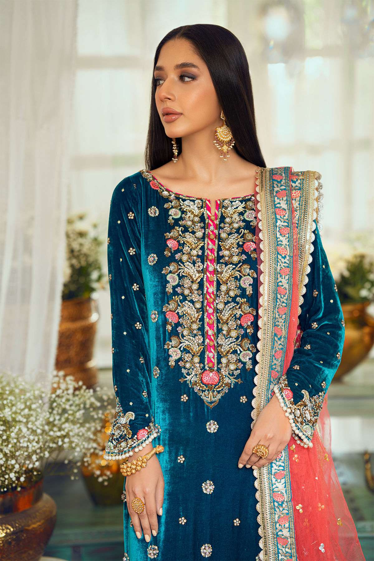 Long silhouette velvet shirt in a gorgeous deep aquamarine shade featuring handcrafted zardozi neckline adorned with peach silk thread floral rosettes. The shirt is adorned with boti and sequins details all over and finished with lace edging. The shirt can be paired with coral dupatta featuring block printed details on borders adorned with sequins spray and lace all over. The outfit can be paired with pure damask flared pants for more festive look.