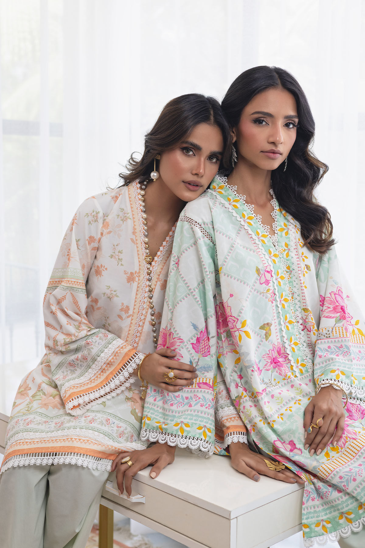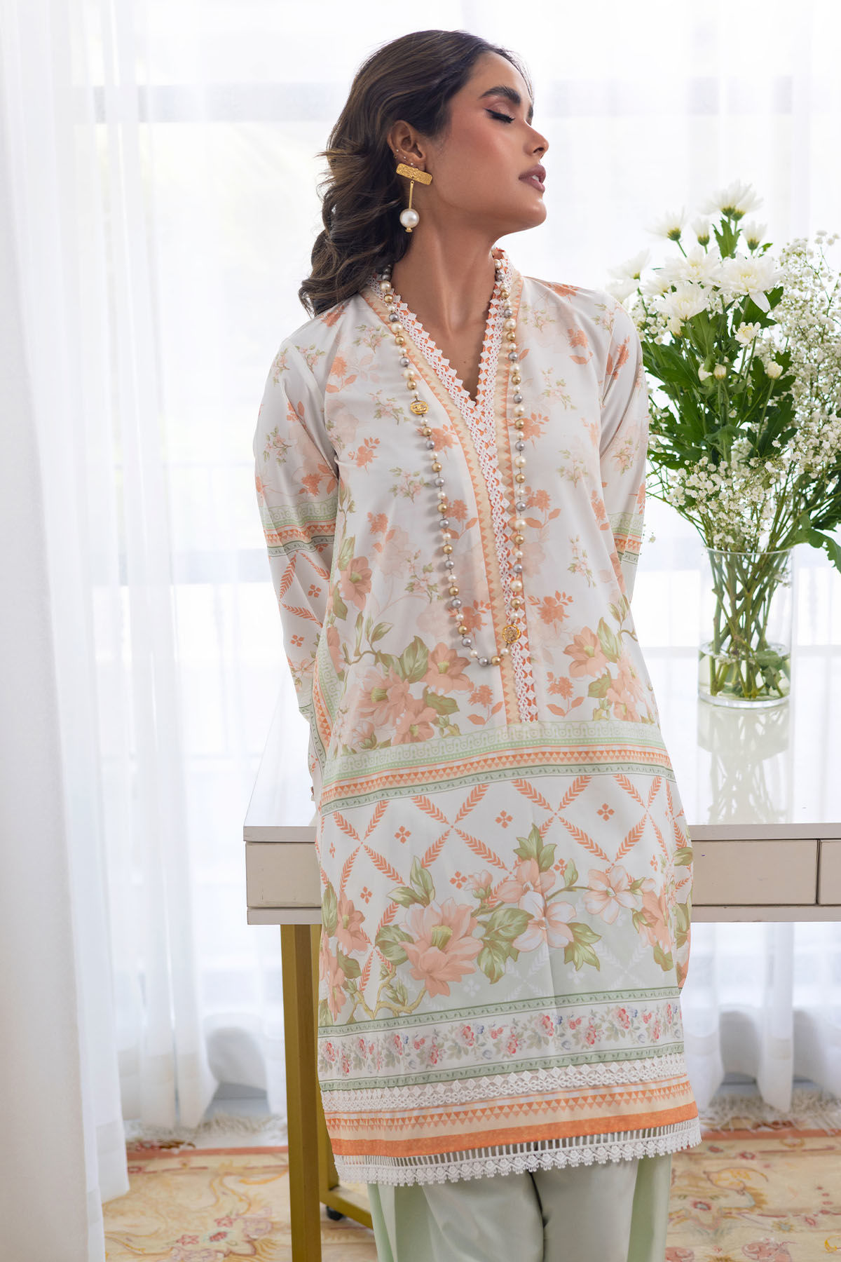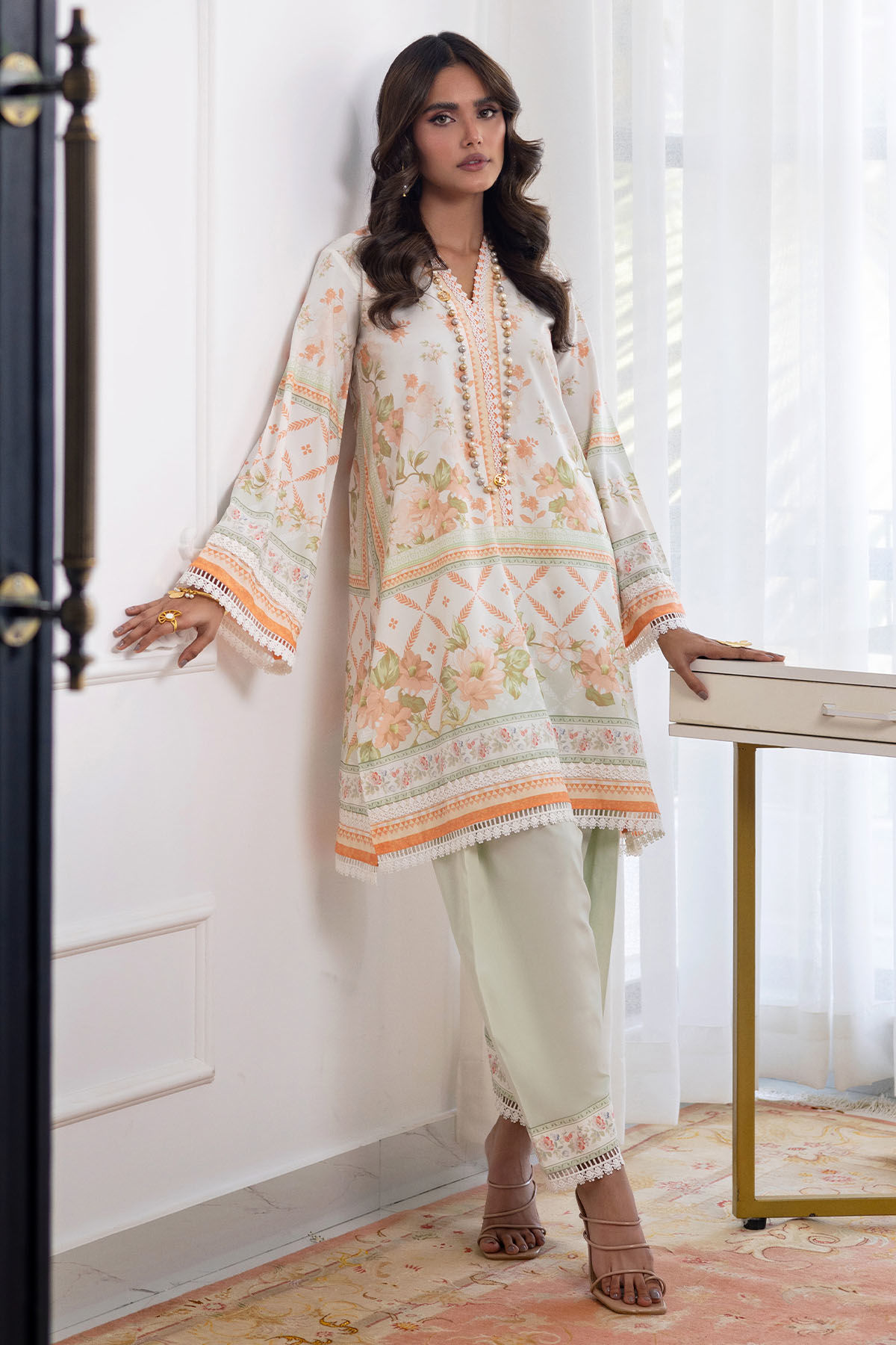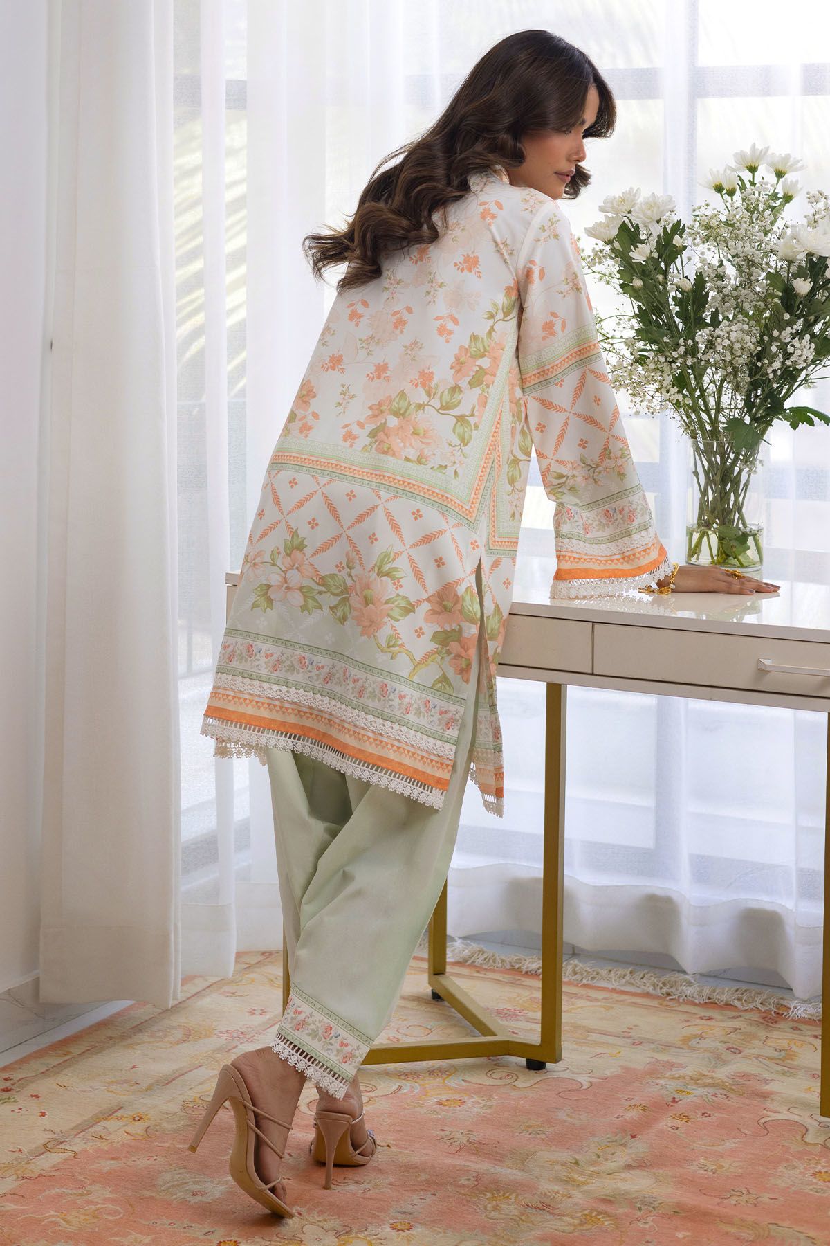 Knee length shirt in stunning shade of mint featuring gorgeous floral printed details in peach and tangerine. The shirt can be paired with straight shalwar featuring lace and printed hem details.
