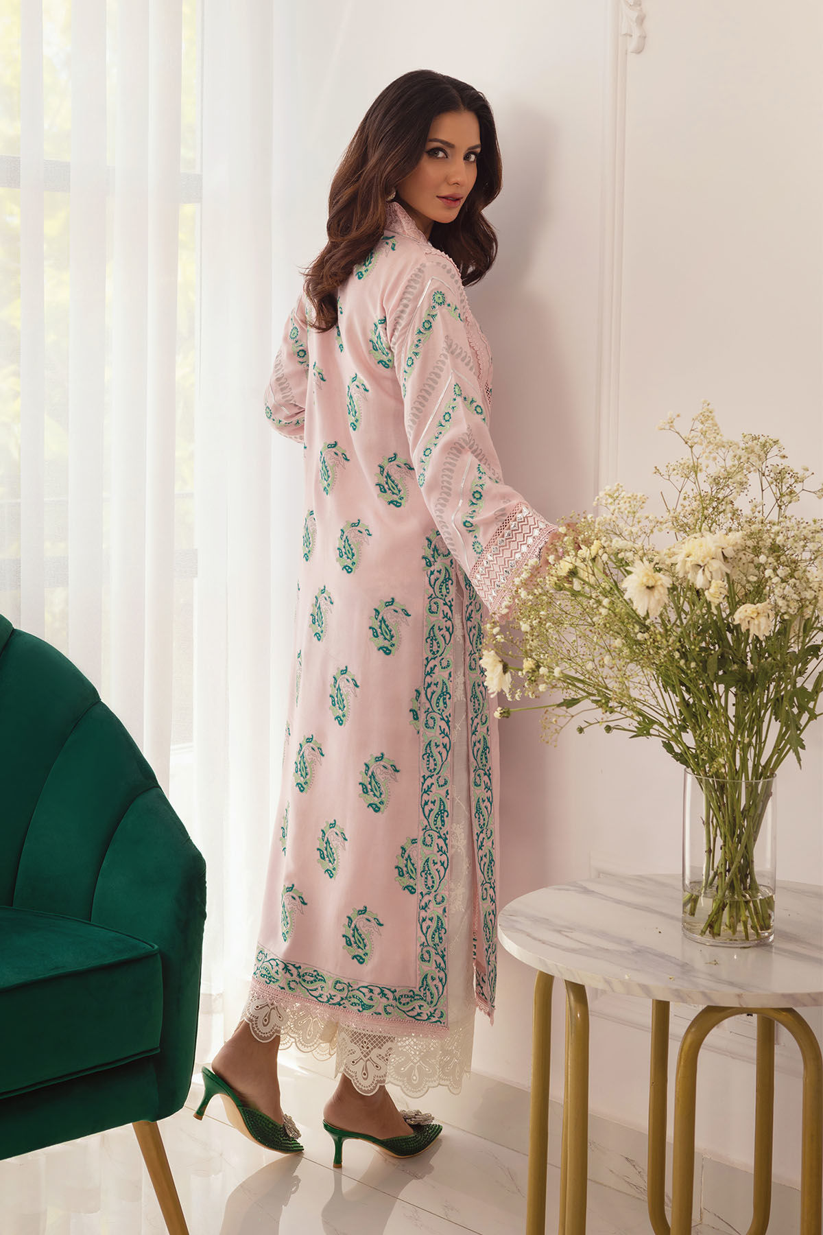 Long silhouette shirt in subtle dreamy shade of pink enhanced with contrasting block printed details. The center front is adorned with lace details and the neckline is accentuated with embossed organza which is further decorated with handcrafted embellishments.