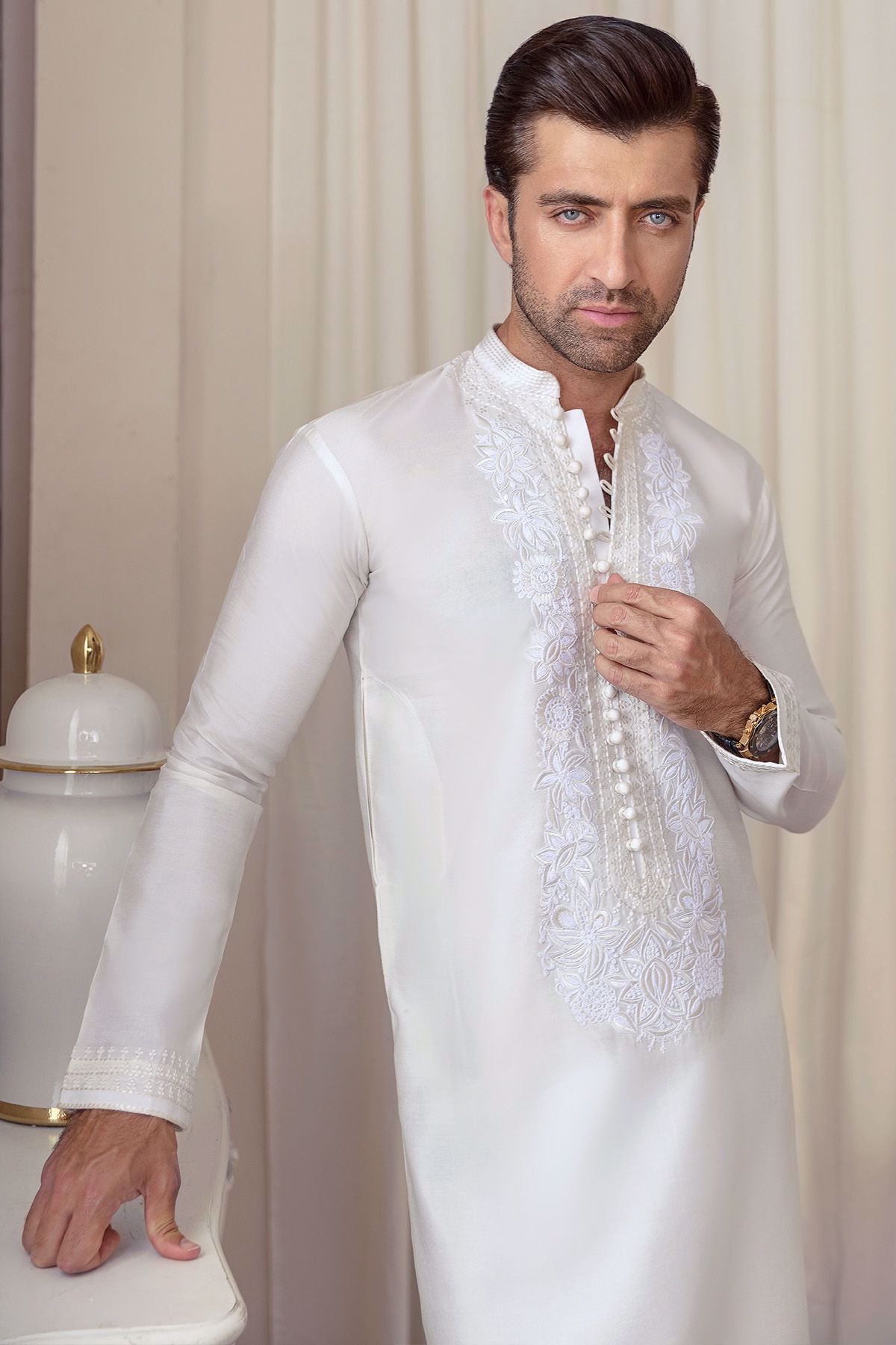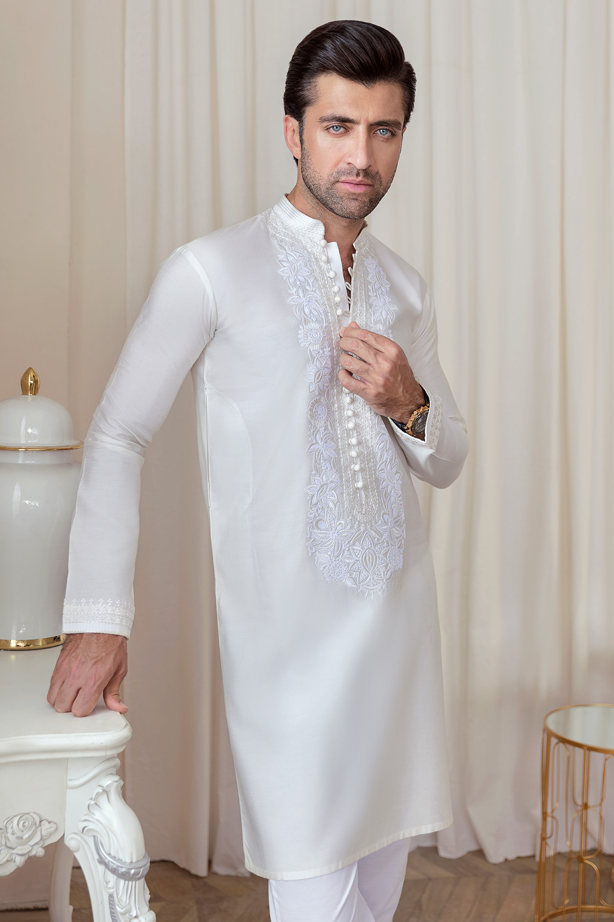 Color: White Fabric: Pure Cotton Work Details: Self-Embroidered