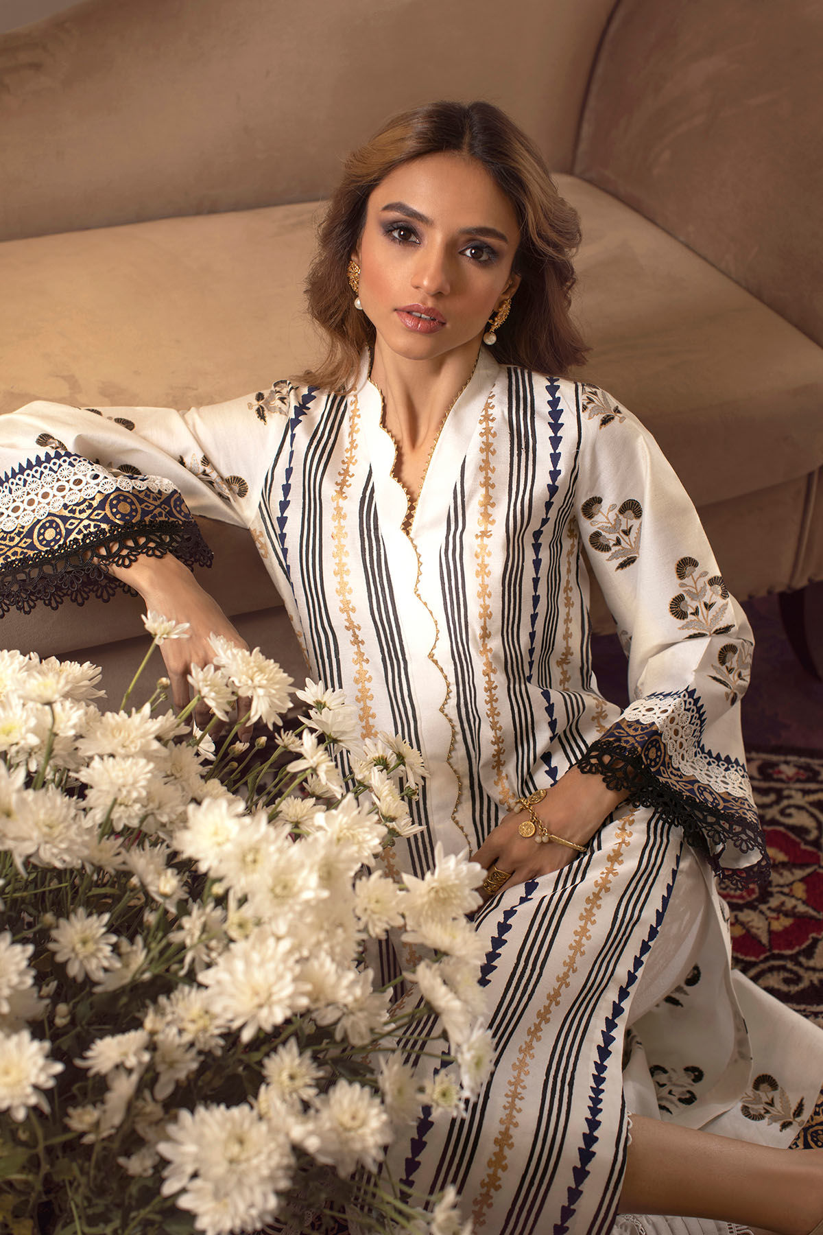Long silhouette cotton net shirt featuring monochrome block printed details enhanced with white and black crochet laces and gota details on scalloped neckline.