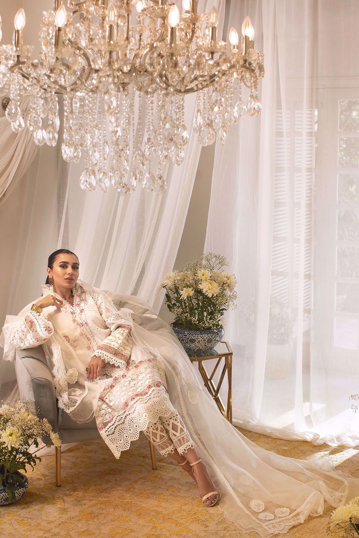 Straight silhouette chikan shirt featuring different patterns of chikan sewn together with laces and gota. The neckline and hem of the shirt are enhanced with cross stitch embroidered details. The neckline is further adorned with handcrafted embellishments featuring pearls, dabka and light catching crystals. The shirt is paired with designed Raw Silk Leila pants and signature dupatta featuring ruffles and appliqué details with pearls and crystals.