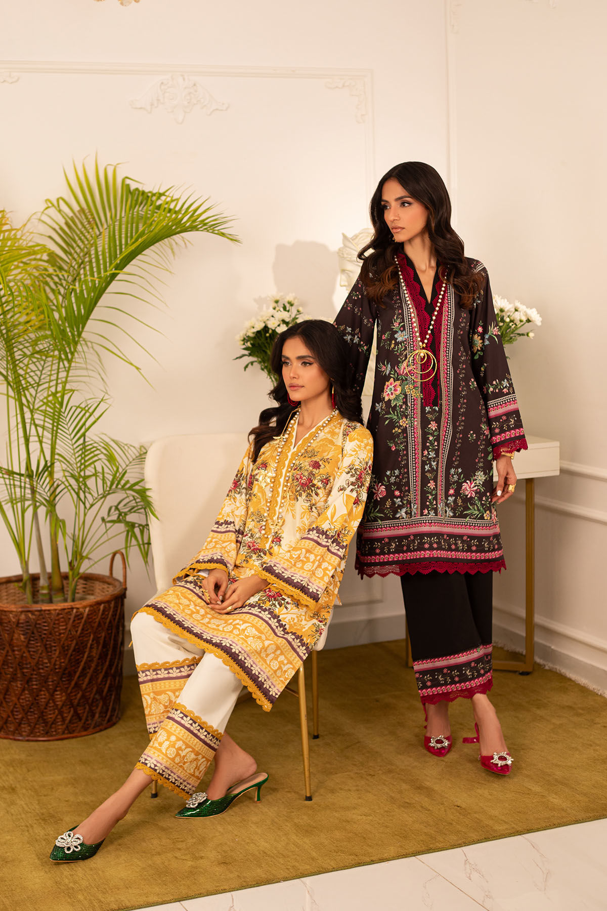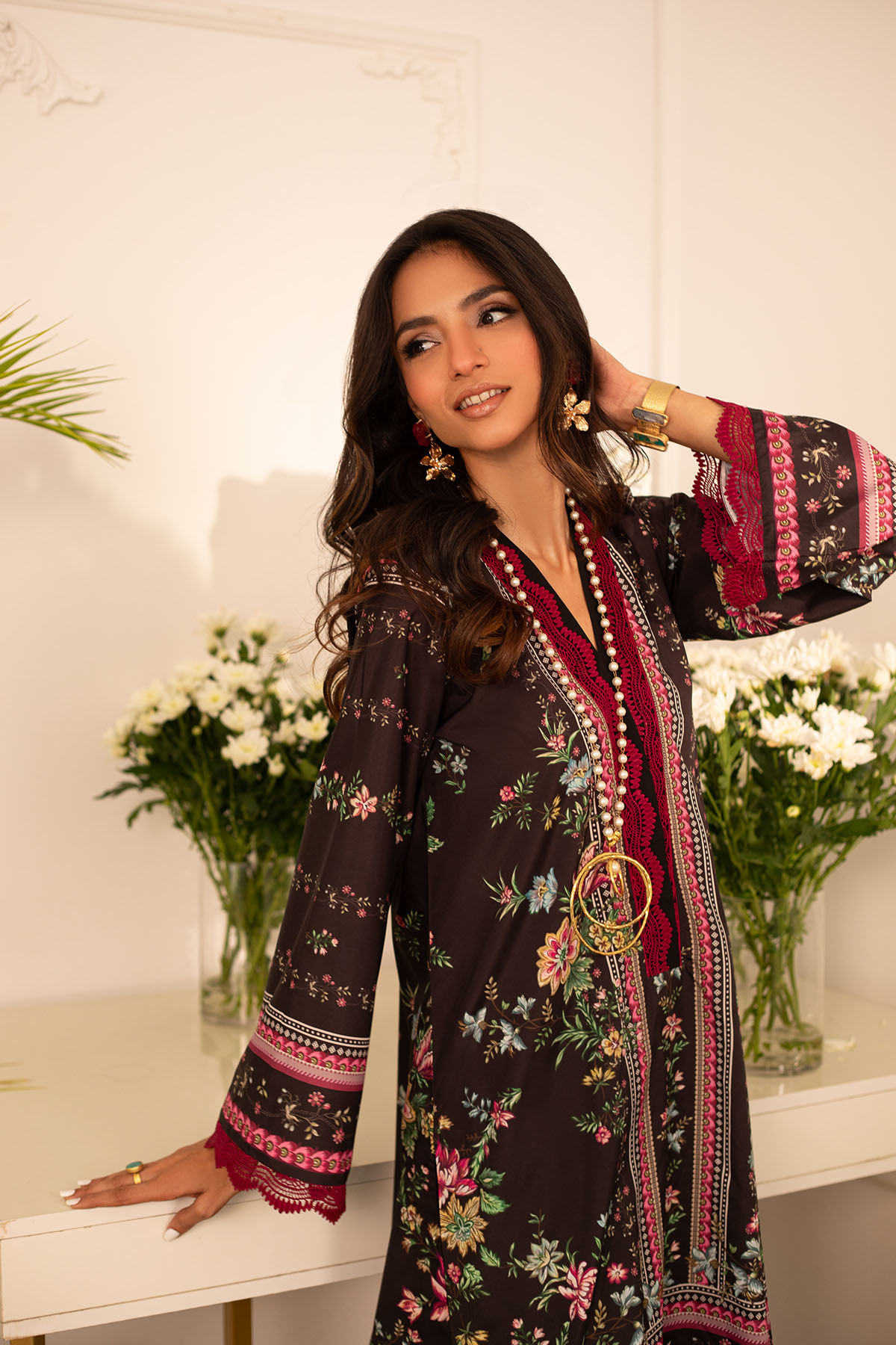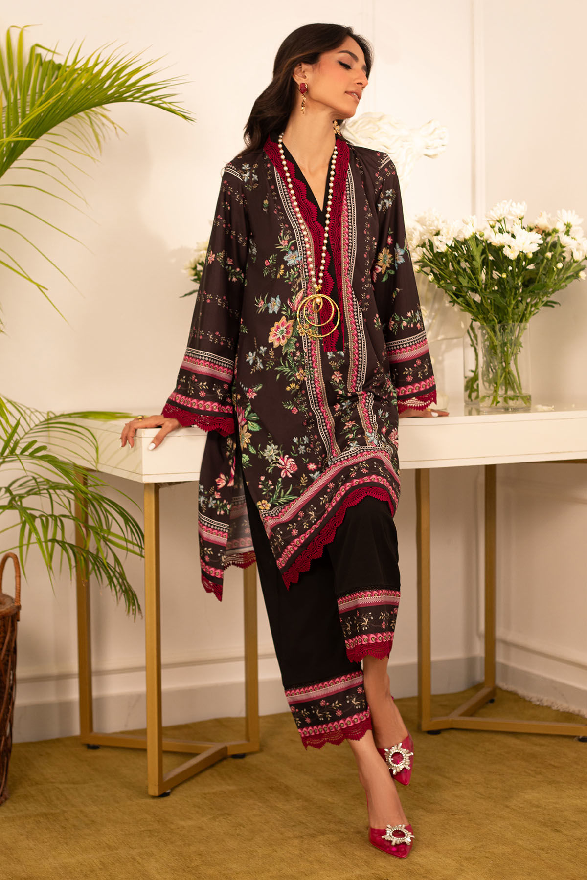 Quirky, trendy yet elegant co-ord set on crepe silk featuring balanced and carefully crafted prints, enhanced with lace details, is a must-have in your closet this summer.