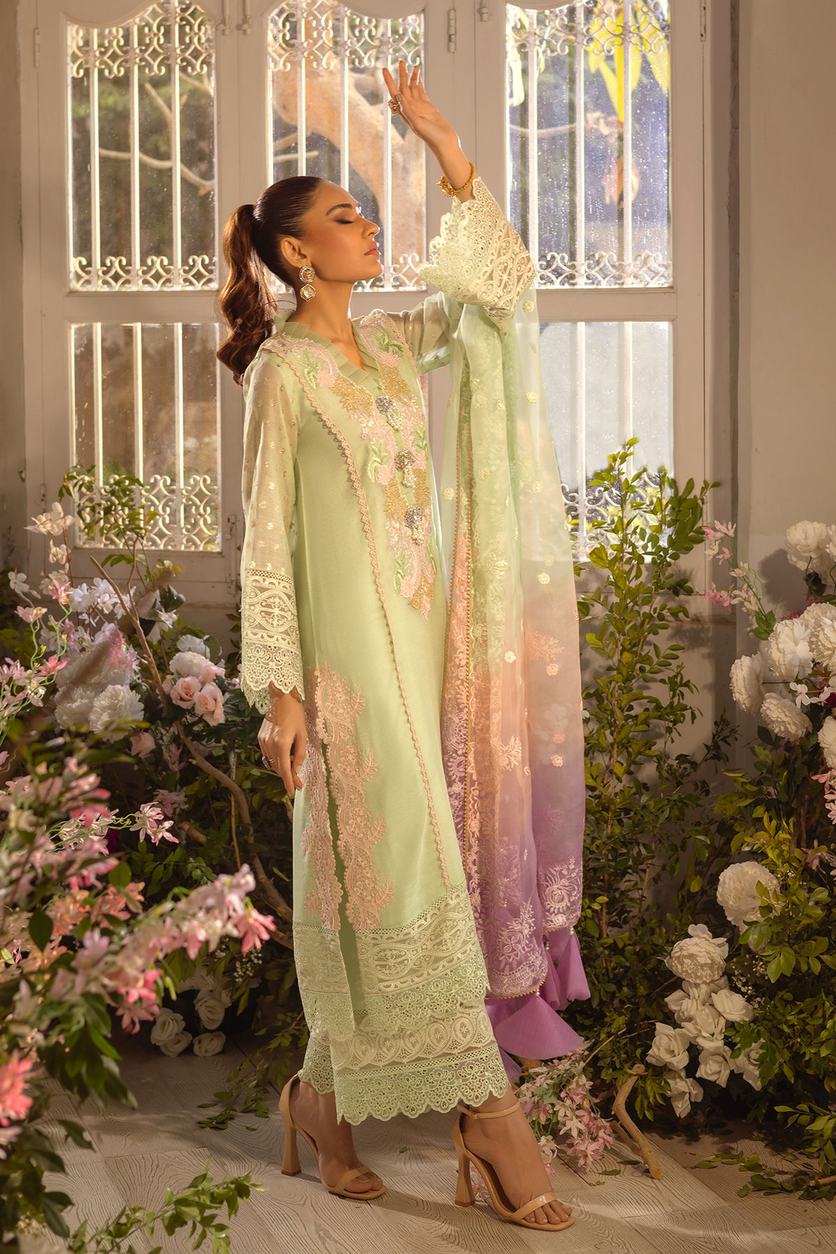 Long silhouette shirt in gorgeous mint shade featuring raw silk and lorex appliqué details on center front. The neckline is further adorned with ruffles and handcrafted embellishments. The shirt can be paired with matching izaar featuring light catching organza borders and lace details on hem. Pair it with ombre organza dupatta in peach and mint shade to create a head turning festive look.