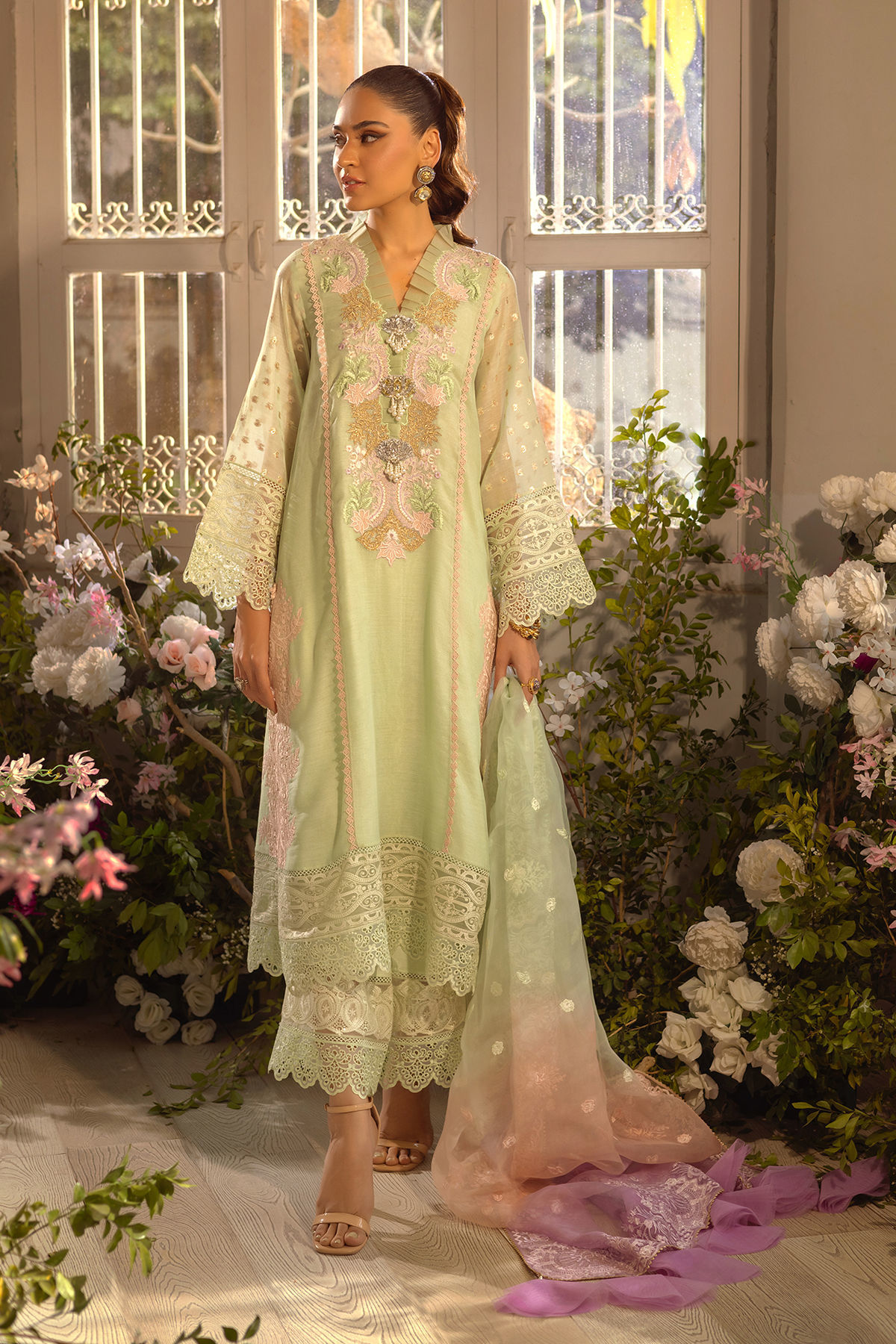 Long silhouette shirt in gorgeous mint shade featuring raw silk and lorex appliqué details on center front. The neckline is further adorned with ruffles and handcrafted embellishments. The shirt can be paired with matching izaar featuring light catching organza borders and lace details on hem. Paired with ombre organza dupatta in peach and mint shade to create a head turning festive look.
