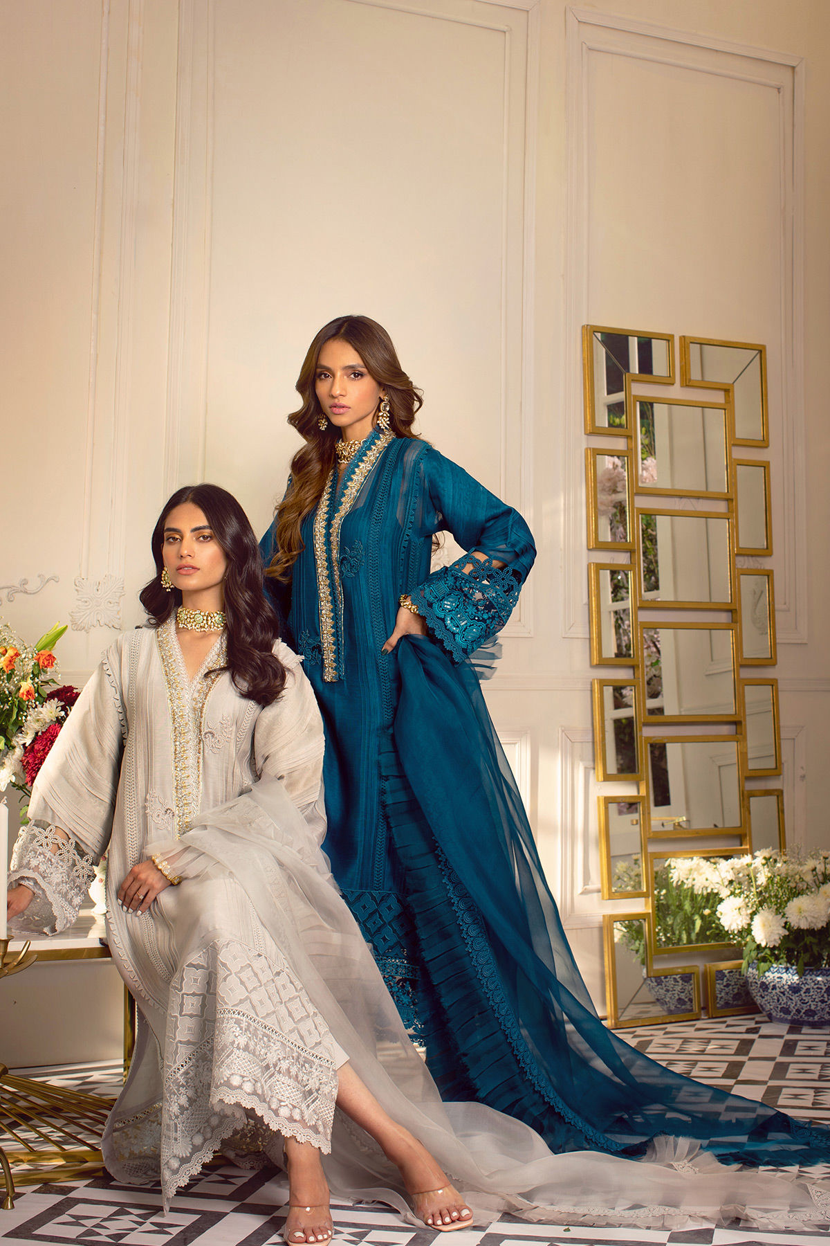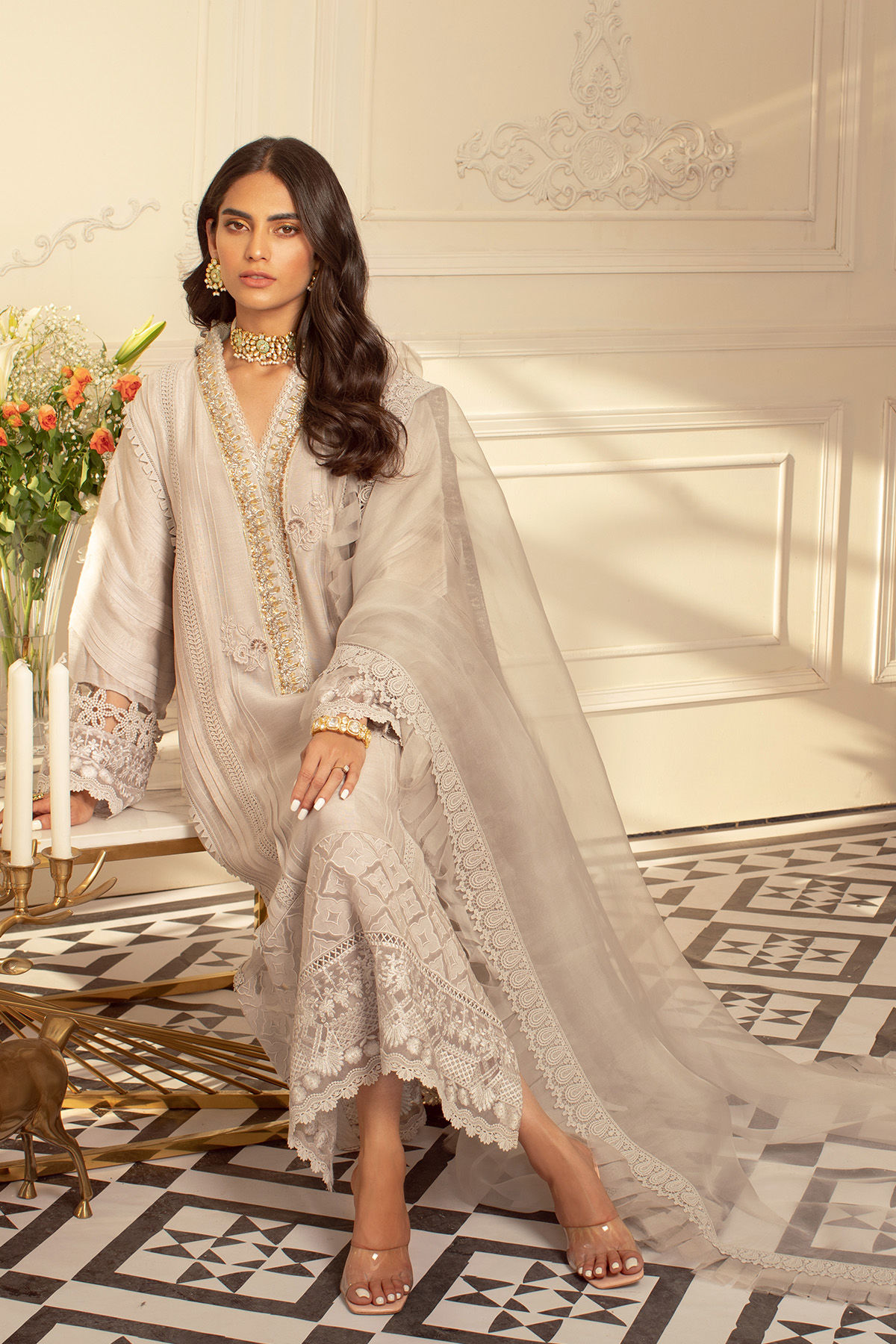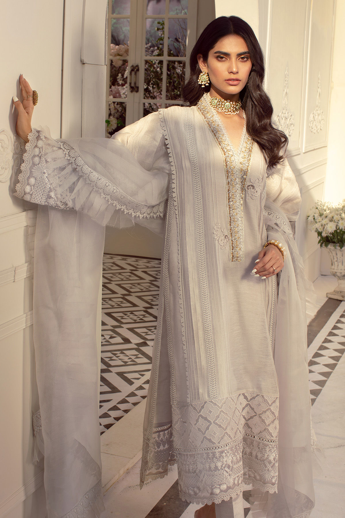 Long silhouette A line shirt in smoke grey featuring handcrafted zardozi detailed neckline in gold and silvers, the neckline is further adorned with lace and resham rosettes, the hem of the shirt is adorned with geometric applique details on pure organza canvas with raw silk. The hemline is also adorned with light catching embossed organza and finished with lace details. The sleeves are made to perfection with 3D pleats details incorporated with lace details. The shirt can be paired with plain raw silk pants. The outfit is paired with organza pleated dupatta featuring crochet lace and fringe details.