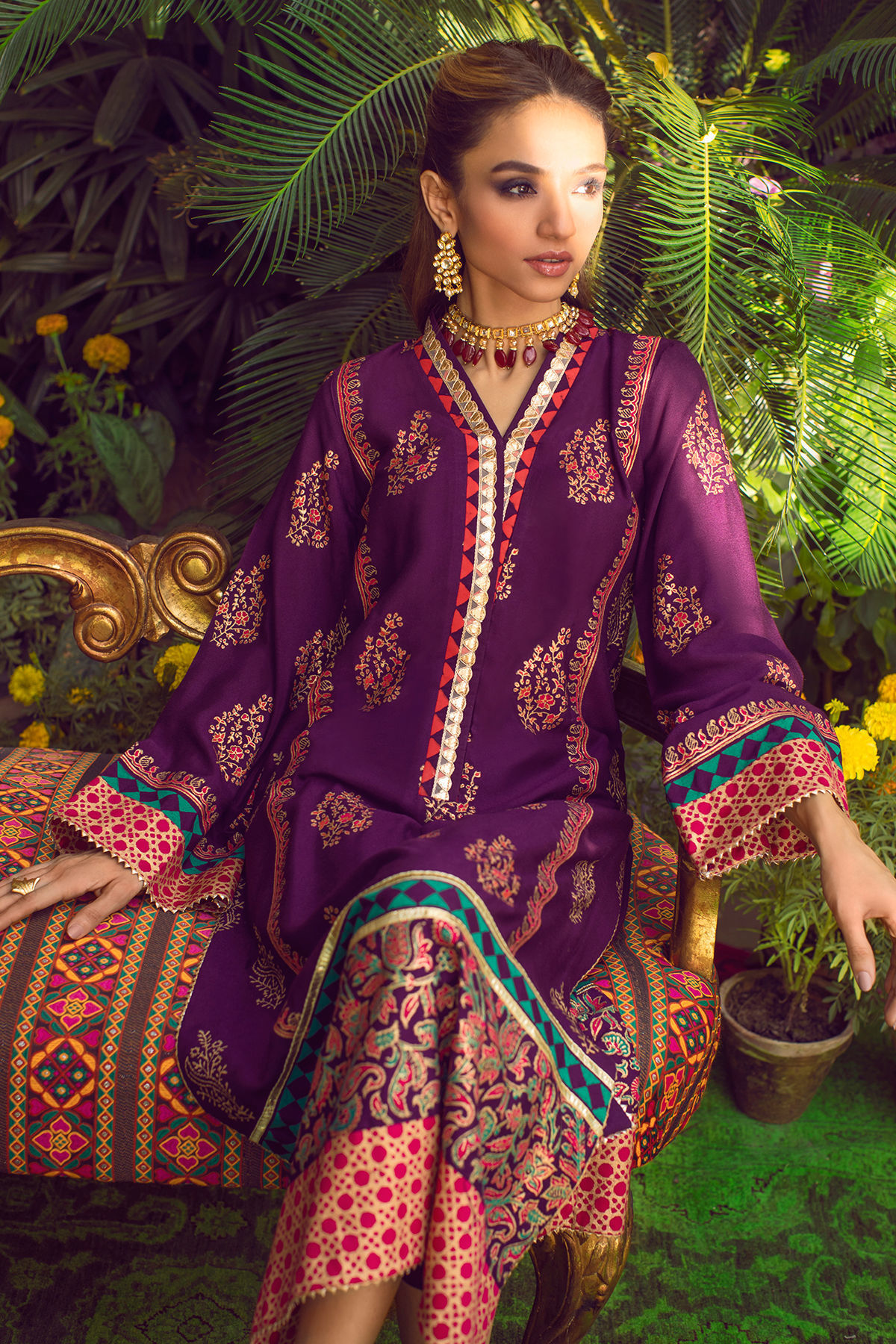 Long silhouette shirt in deep aubergine featuring gold, silver and multicolored hand block printed details. The neckline is enhanced with gota lace. The shirt comes with straight pants featuring gota on the hem.