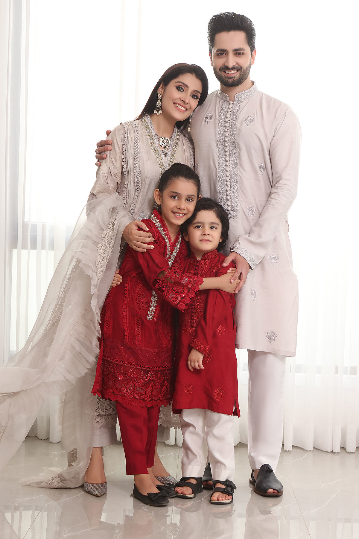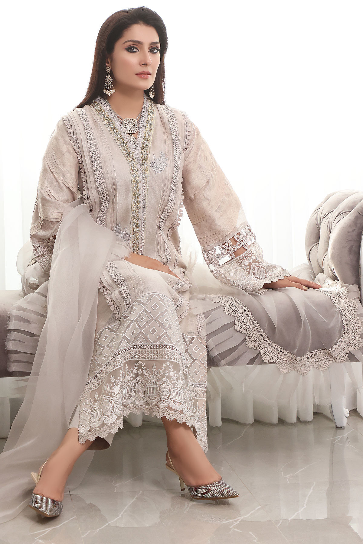 Long silhouette A line shirt in grey featuring handcrafted zardozi detailed neckline in gold and silvers, the neckline is further adorned with lace and resham rosettes, the hem of the shirt is adorned with geometric applique details on pure organza canvas with raw silk. The hemline is also adorned with light catching embossed organza and finished with lace details. The sleeves are made to perfection with 3D pleats details incorporated with lace details. The shirt can be paired with plain raw silk pants. The outfit is paired with organza pleated dupatta featuring crochet lace and fringe details.