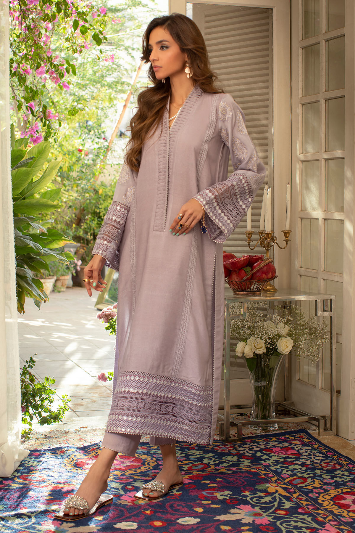 Long silhouette cotton net shirt in dreamy lilac featuring embossed organza details incorporated with crochet laces. The neckline is handcrafted to perfection with fabric manipulation details. The sleeves are created with self zari embroidered rawsilk.