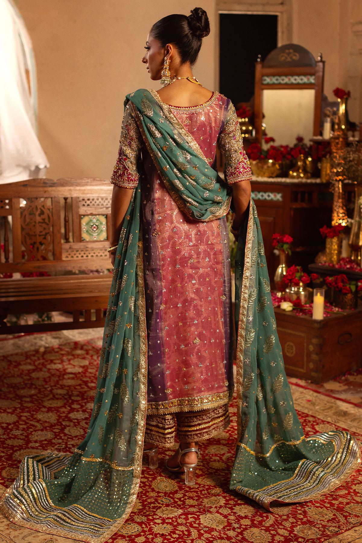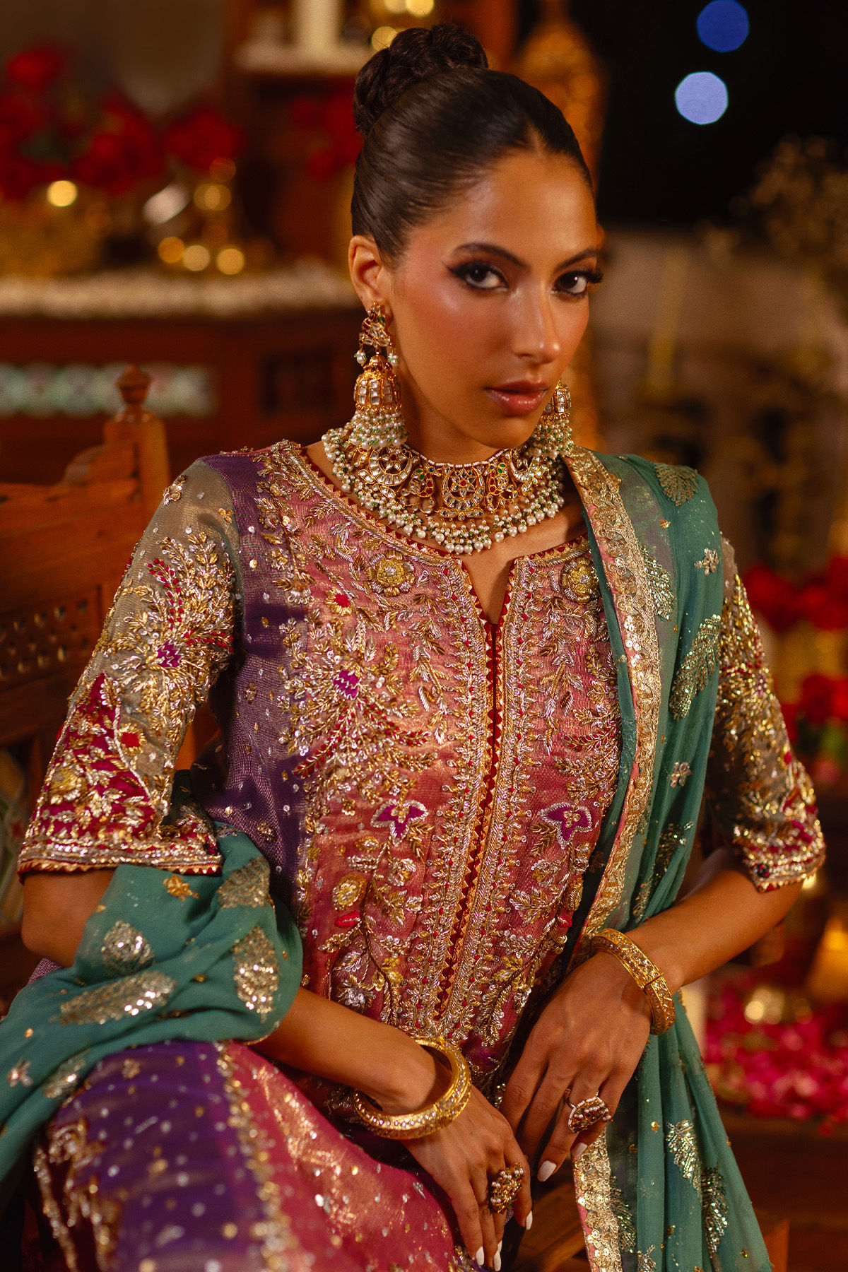 An A-line color-blocked shirt crafted from zari net canvas in the striking shades of aubergine and bubblegum pink, featuring an elegantly composed zardozi neckline. The hemline is meticulously designed with velvet appliqué, embellished with traditional zardozi details. Additionally, the hemline is adorned with gota accents. The ensemble is complemented by a two-legged izaar with zari borders and intricate gota detailing. Accompanying the outfit is a contrasting chiffon dupatta, embellished with sequins that capture light and featuring gota manipulation on the organza panel of each pallu.
