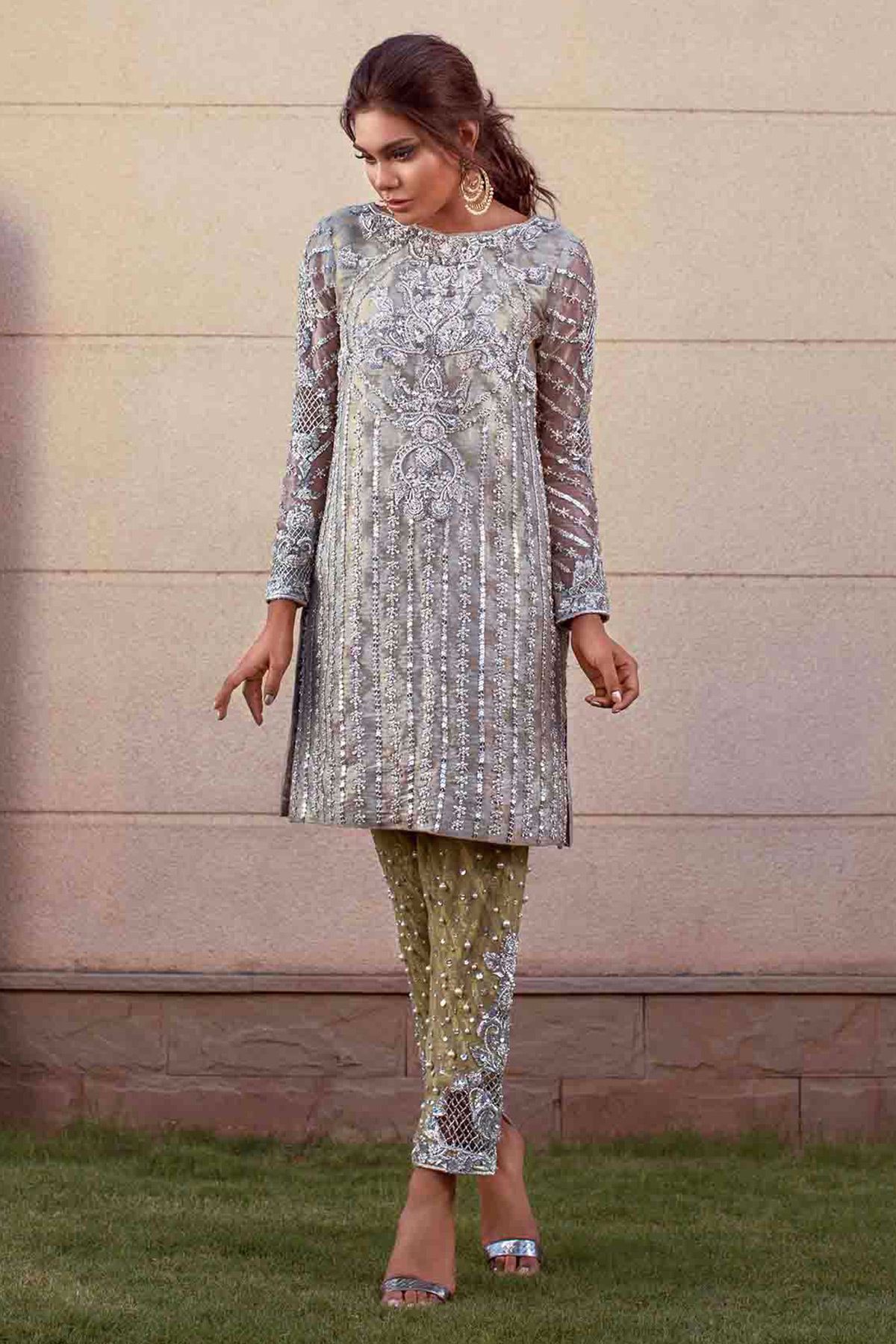 Zari cotton net straight shirt with self-pattern details enhanced with all silver hand embroidered details of dabka, sequins and light catching crystals, the organza sleeves are enhanced with cutwork details. The sage green pants with hand embroidered details of dabka, naqshi and pearls completes the look.