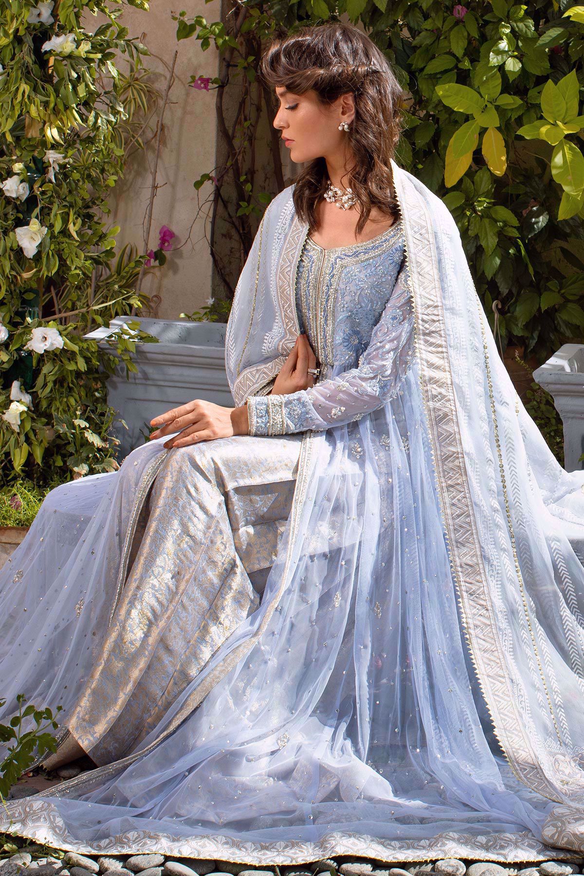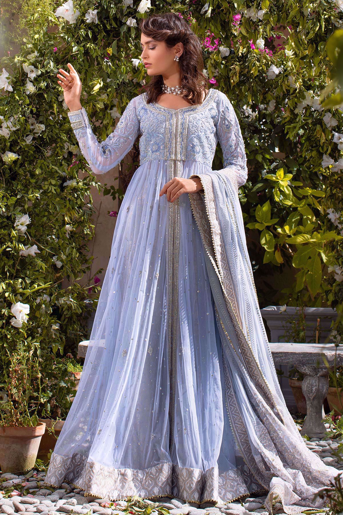 Long and flared silhouette pale blue pishwas with subtle embroidered details that are enhanced with dabka and single thread embroidered details. The net pishwas is adorned with sequins and pearls on the front and back which is finished with hand block printed border. The chiffon dupatta with hand block printed details incorporated with sequins completes the look. The pishwas is paired with pleated flared damask pants.