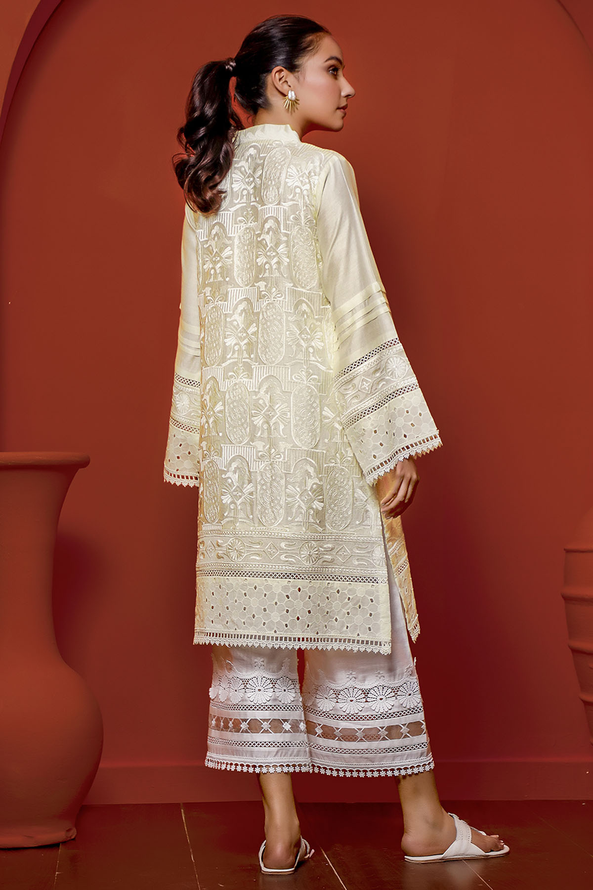 Raw silk self-embroidered shirt in subtle shade of pastel yellow, the hemline of the shirt is enhanced with chikan panel and matching crochet laces. The shirt comes with bell sleeves featuring pleats and mix and match of chikan and embroidered raw silk panels.