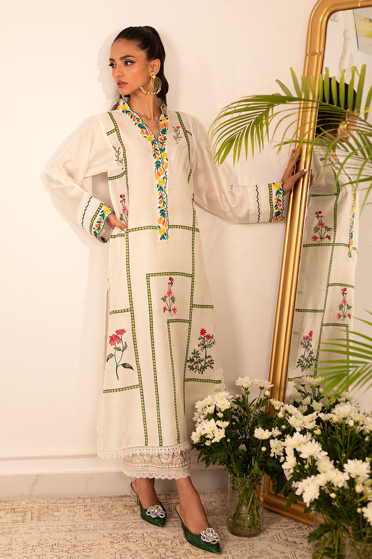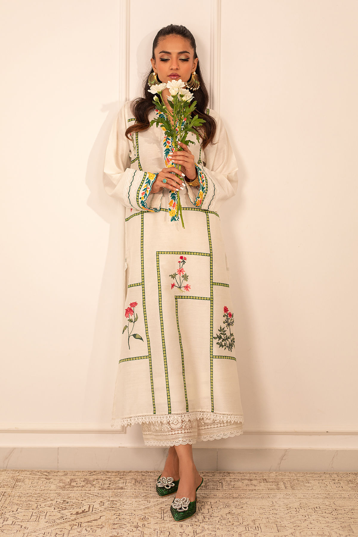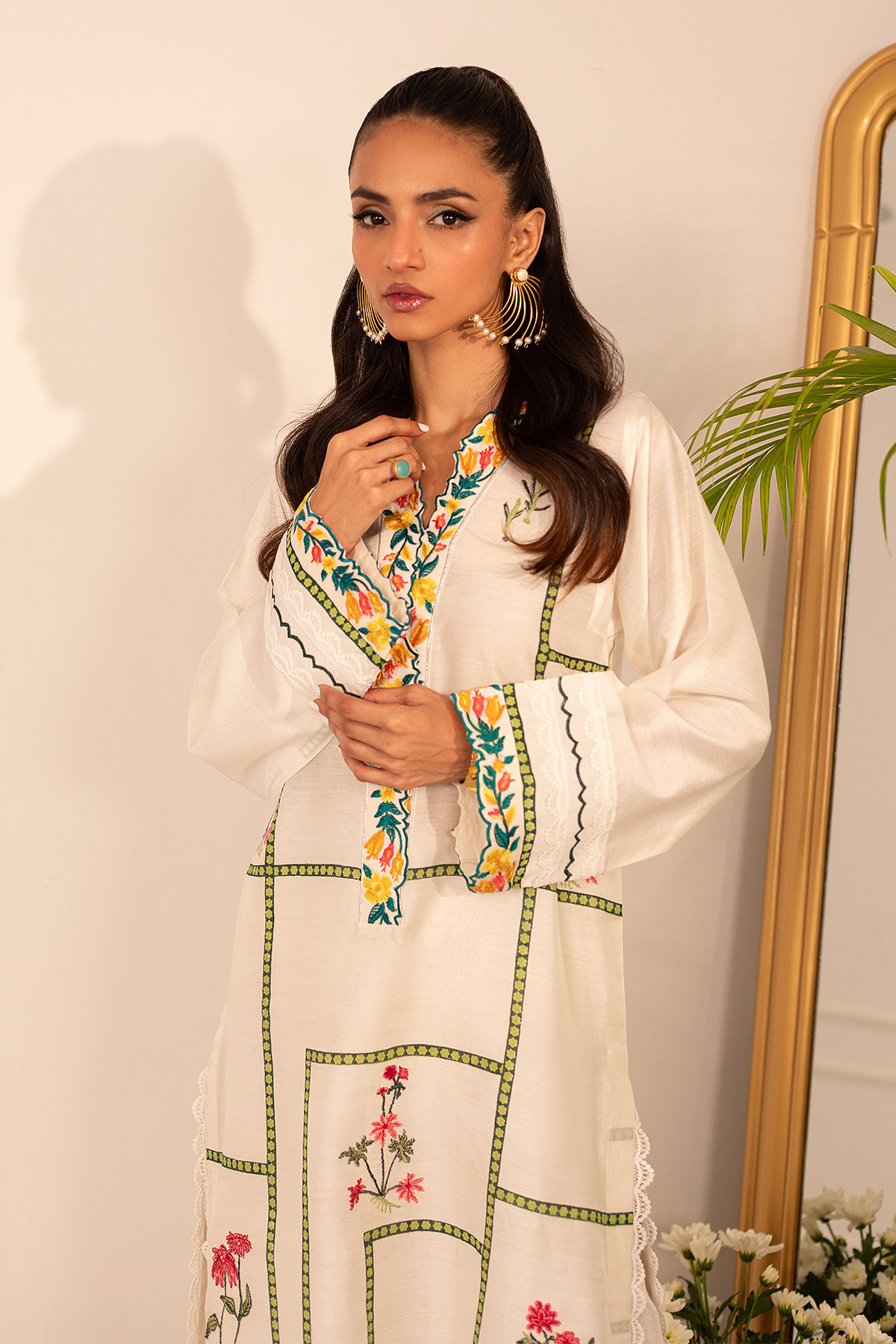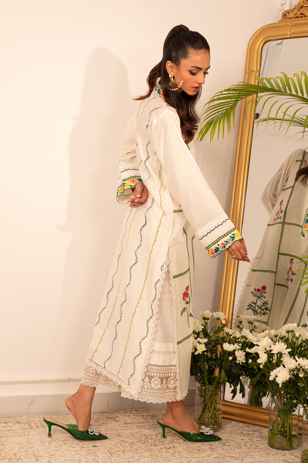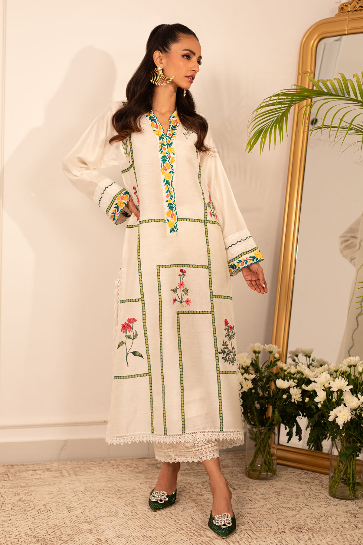 Long silhouette cotton net shirt on pristine white canvas featuring hand block printed details adorned with silk thread appliqué motifs. The neckline is carefully crafted with embroidered details. The shirt can be paired with Celina izaar featuring embroidered organza and crochet details