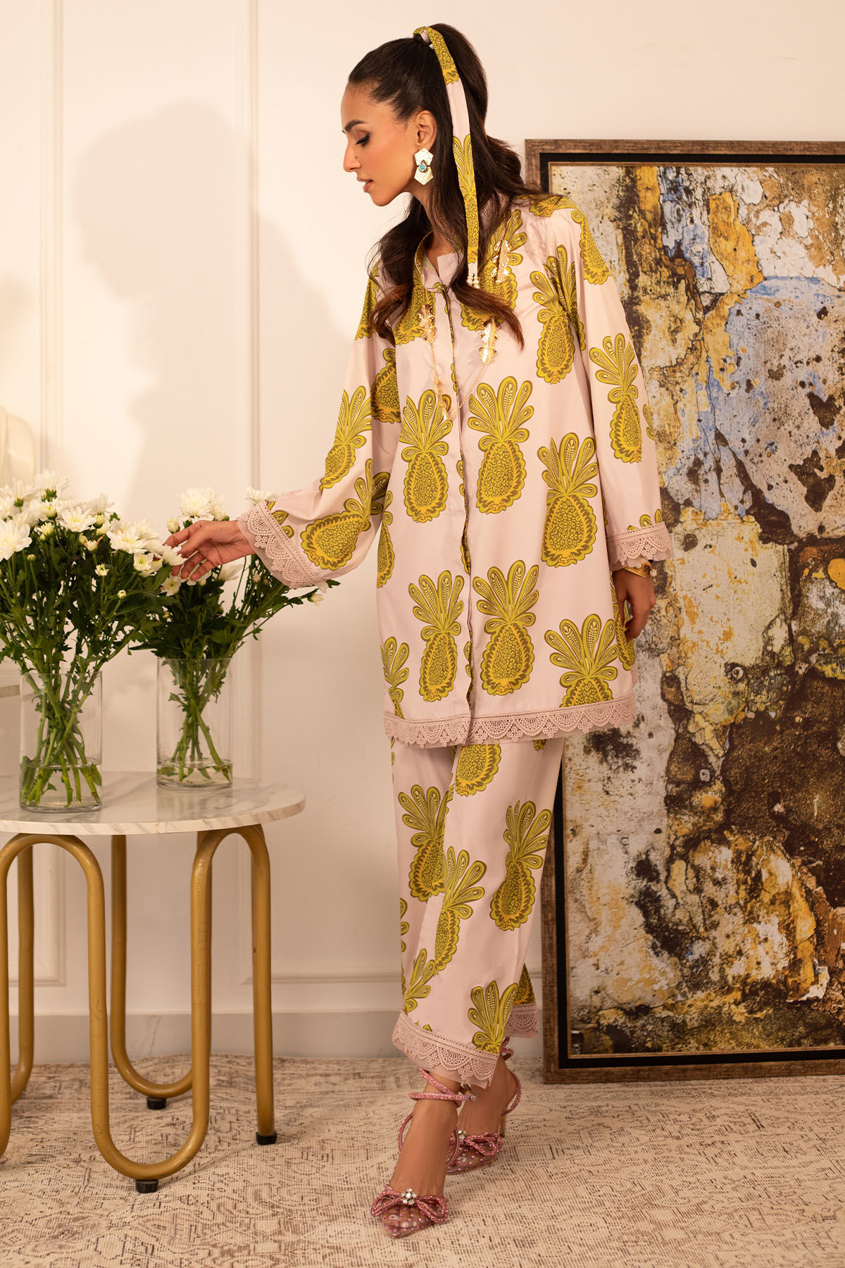Quirky, trendy yet elegant co-ord set on crepe silk featuring balanced and carefully crafted prints, enhanced with lace details, is a must-have in your closet this summer.