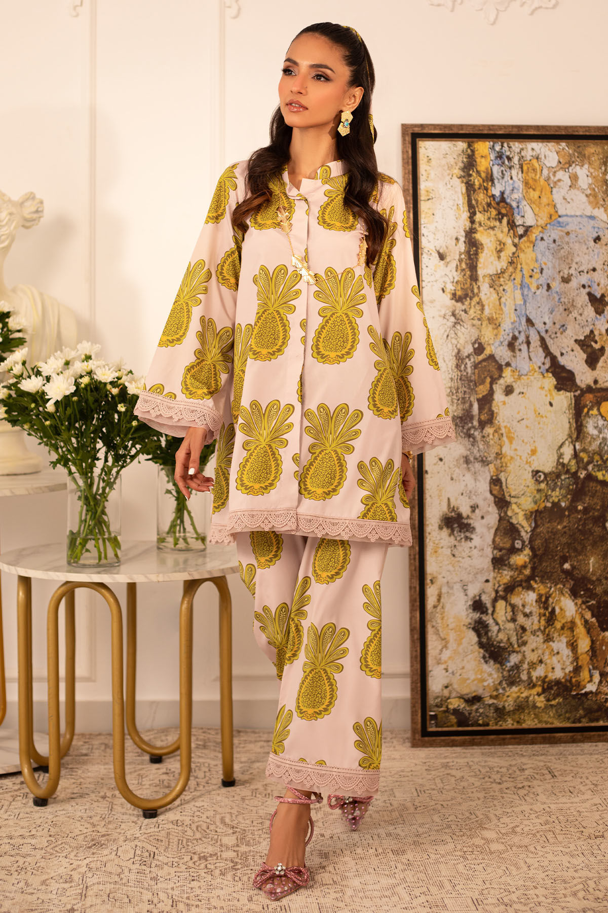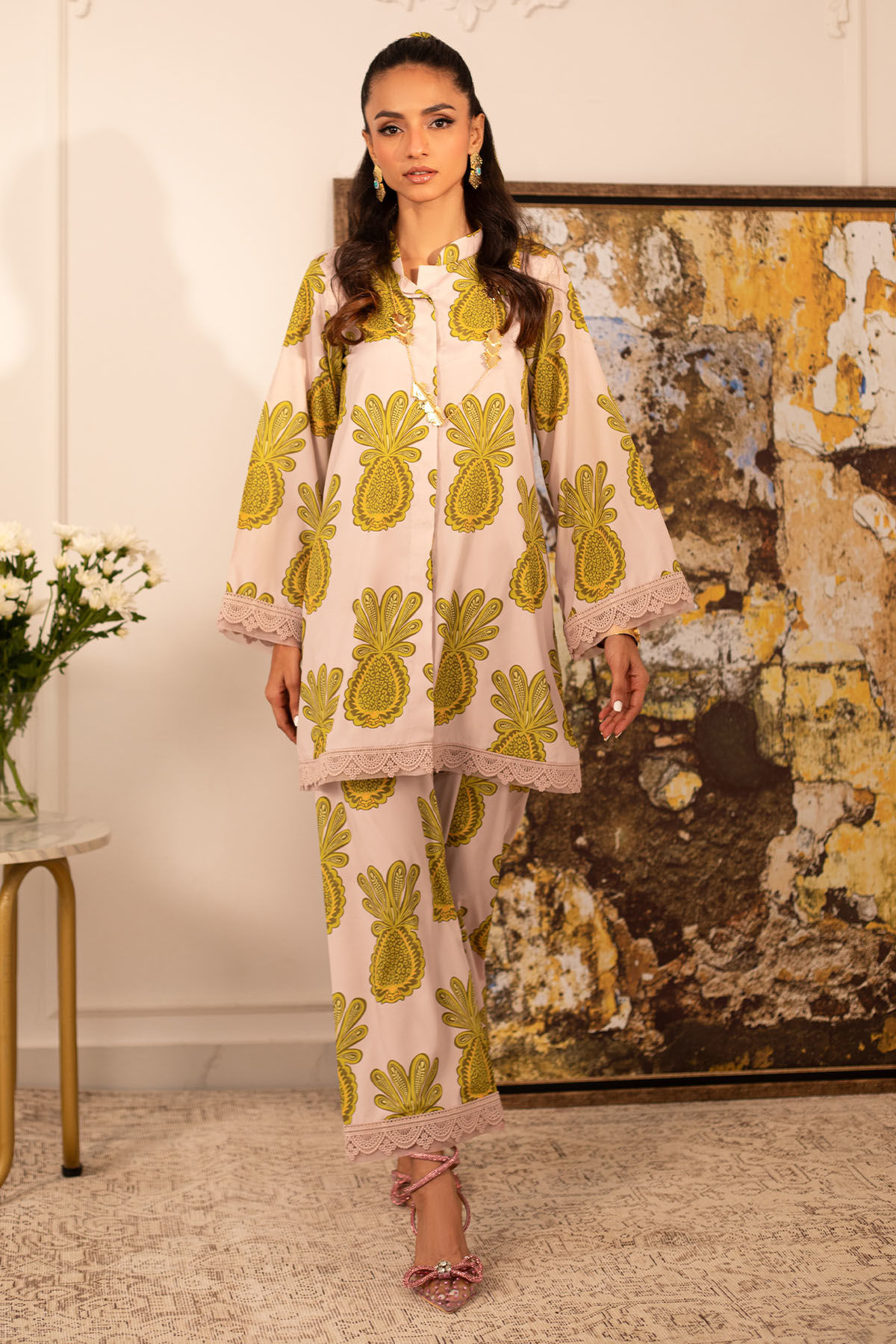 Quirky, trendy yet elegant co-ord set on crepe silk featuring balanced and carefully crafted prints, enhanced with lace details, is a must-have in your closet this summer.