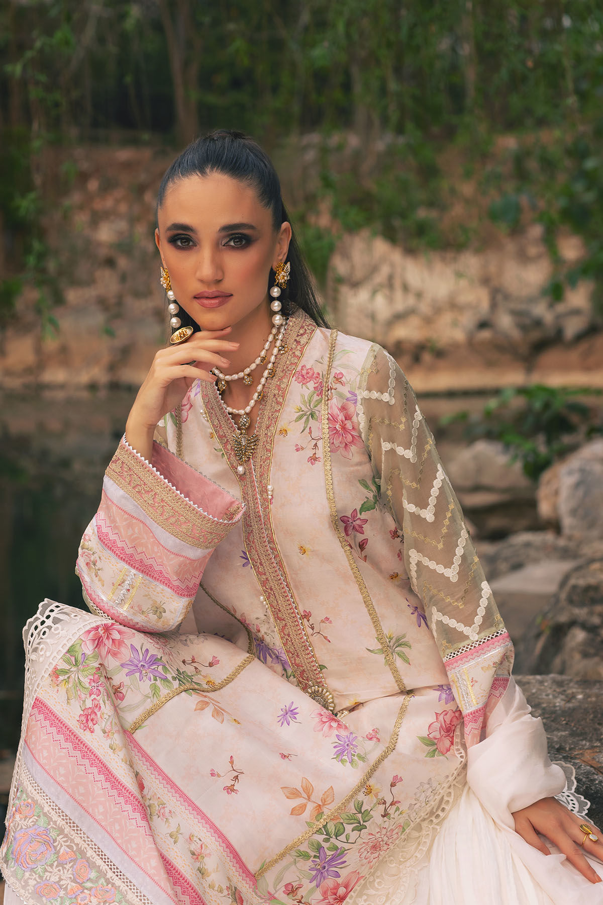 Cut on pure raw silk 'Haleh' features intricate scattered rosettes on dreamy pinky peach canvas featuring subtle textured tone on tone printed details. The side slits are adorned with schiffli details and the neckline is carefully crafted with zari and aari details. The centre front is adorned with handcrafted pearl embellishments and the hem is adorned with multi colored floral embroidered panel on pure organza. The outfit comes with ombre dupatta in most soothing shade of lilac and pink.