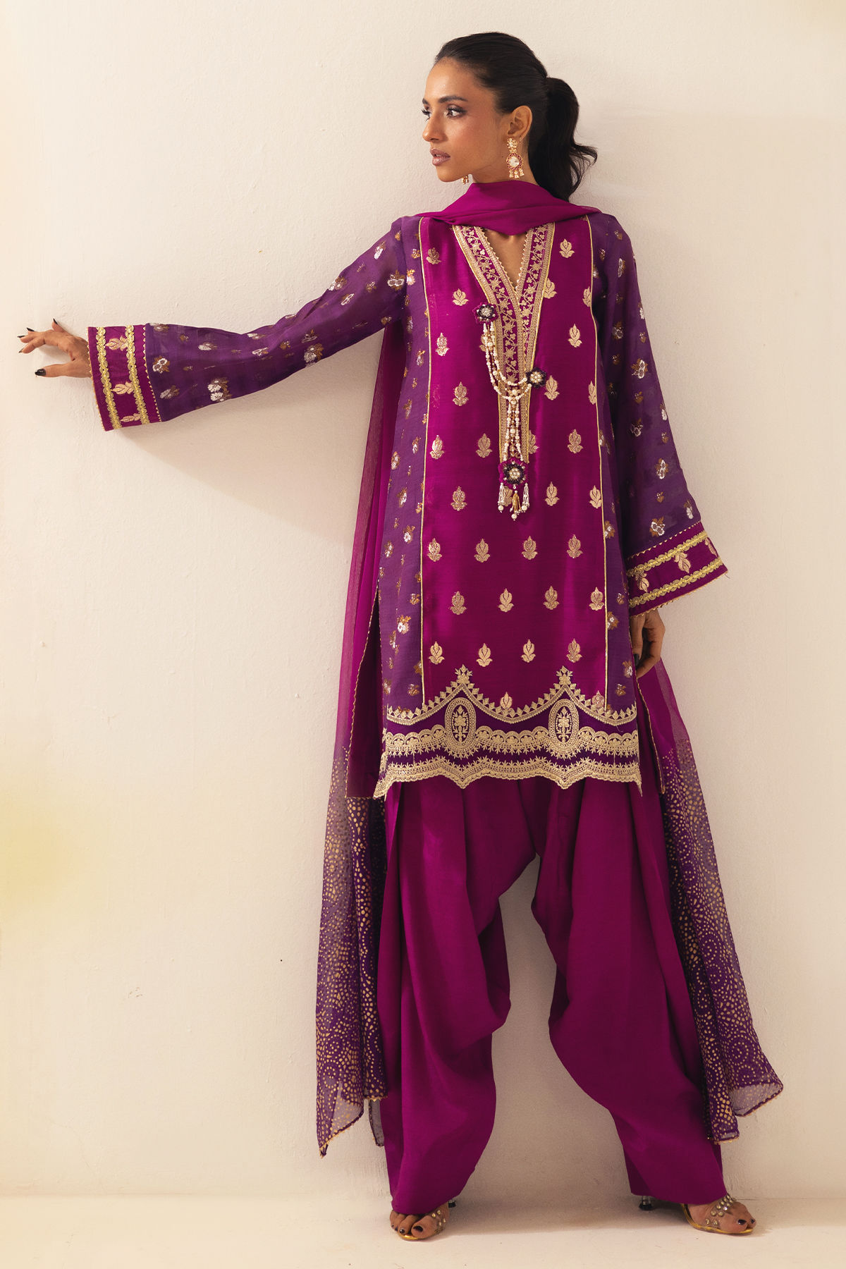 This knee-length color-blocked shirt, crafted from a luxurious lorex canvas in deep aubergine and plum, features a meticulously zari-embroidered neckline embellished with handcrafted tassel details at the center front. The hem is accentuated with exquisite zari appliqué details. To complement this attire, it is accompanied by farshi shalwar and a chiffon dupatta, completing an elegant ensemble.
