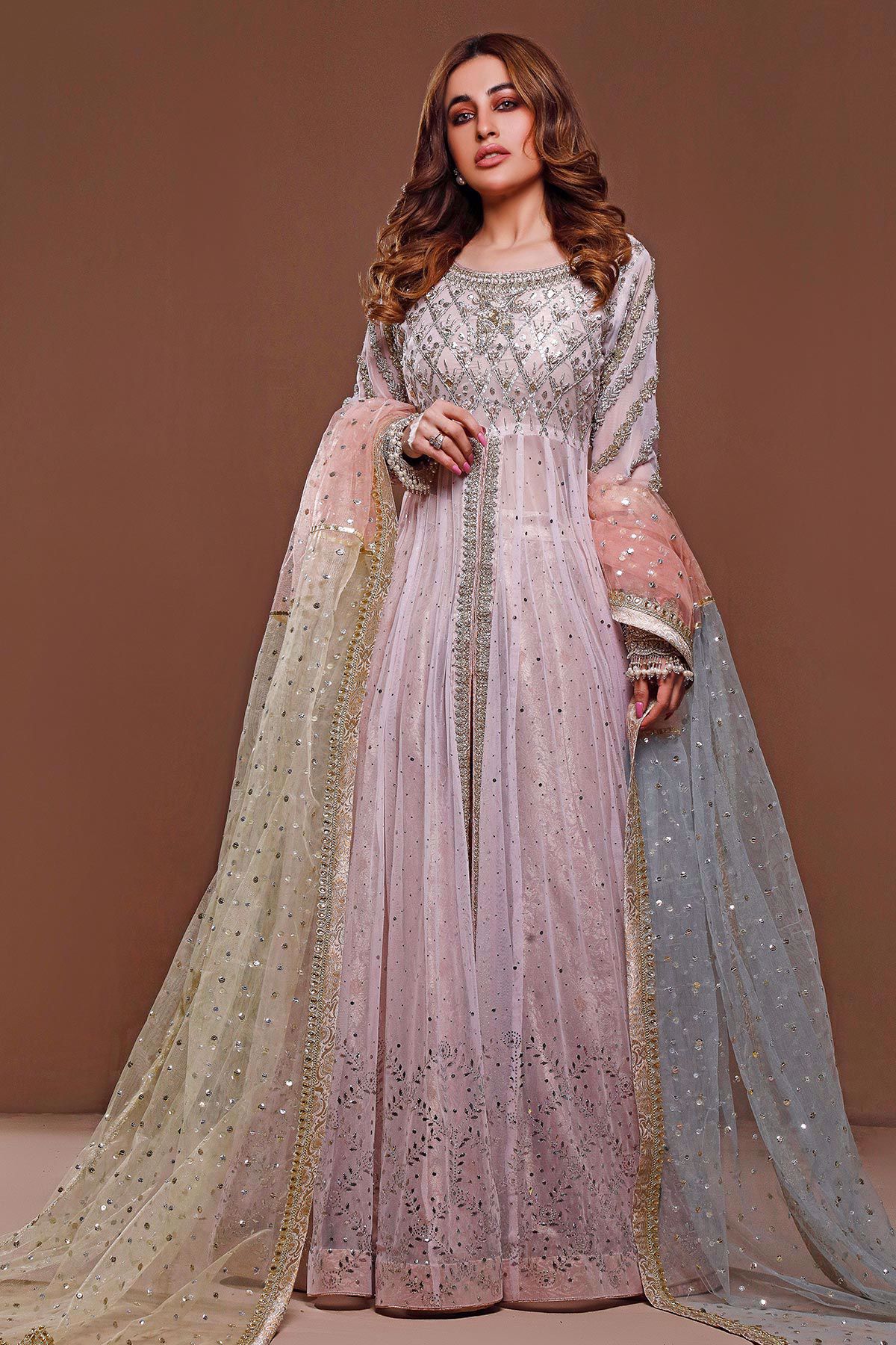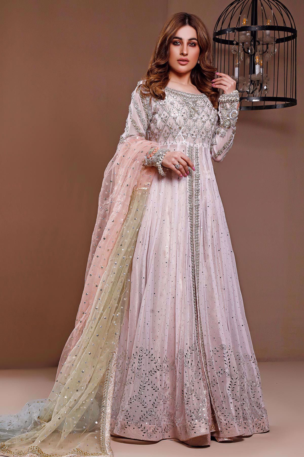 Long silhouette pishwas on pink net canvas with gorgeous zardozi details on the bodice. The pishwas has gorgeous kaamdani details overall in shades of silver. The sleeves are intricately hand embroidered with silk thread rosettes details which are enhanced with kora, dabka and light catching crystals. Color blocked dupatta in shades of mint, baby blue and powder peach makes this outfit head turning.