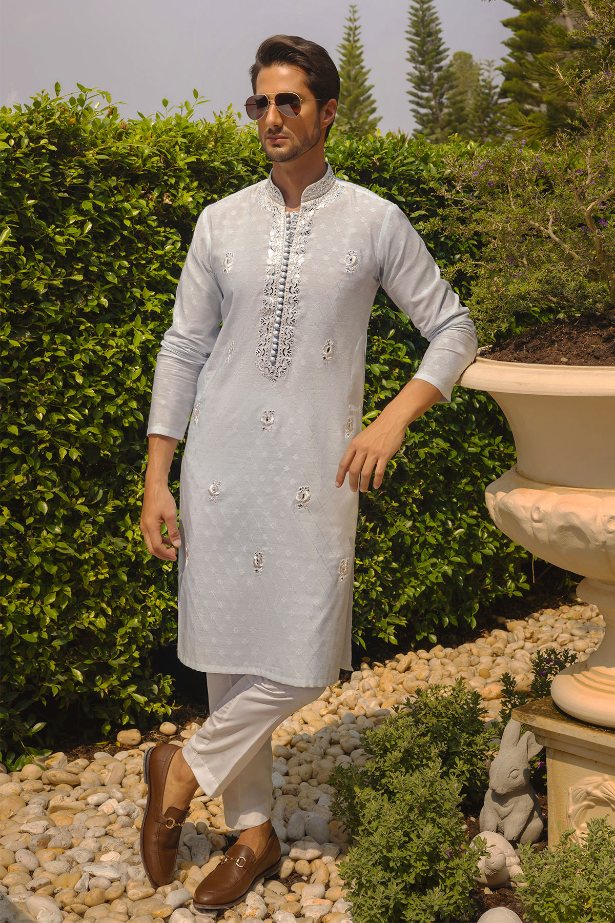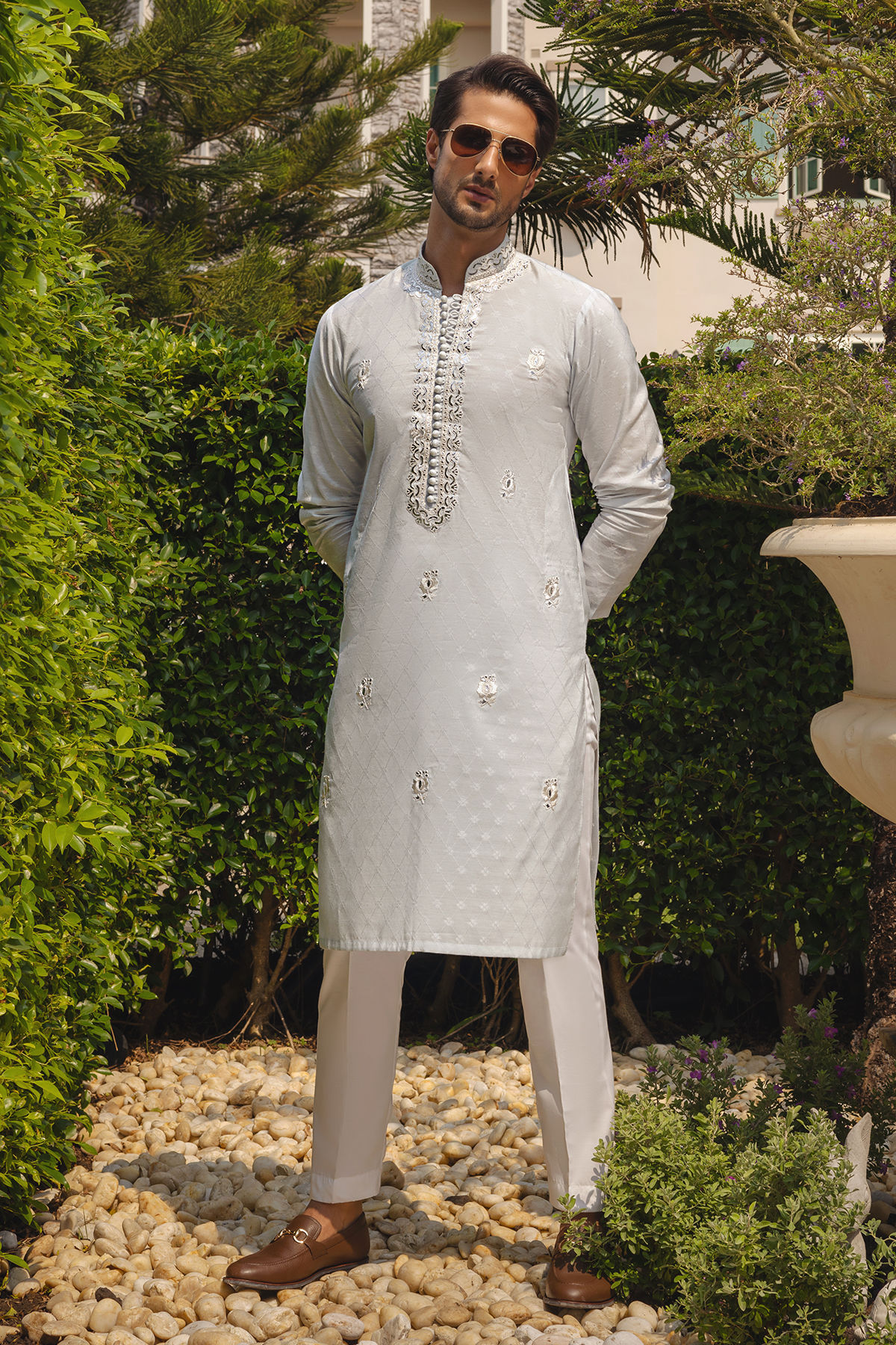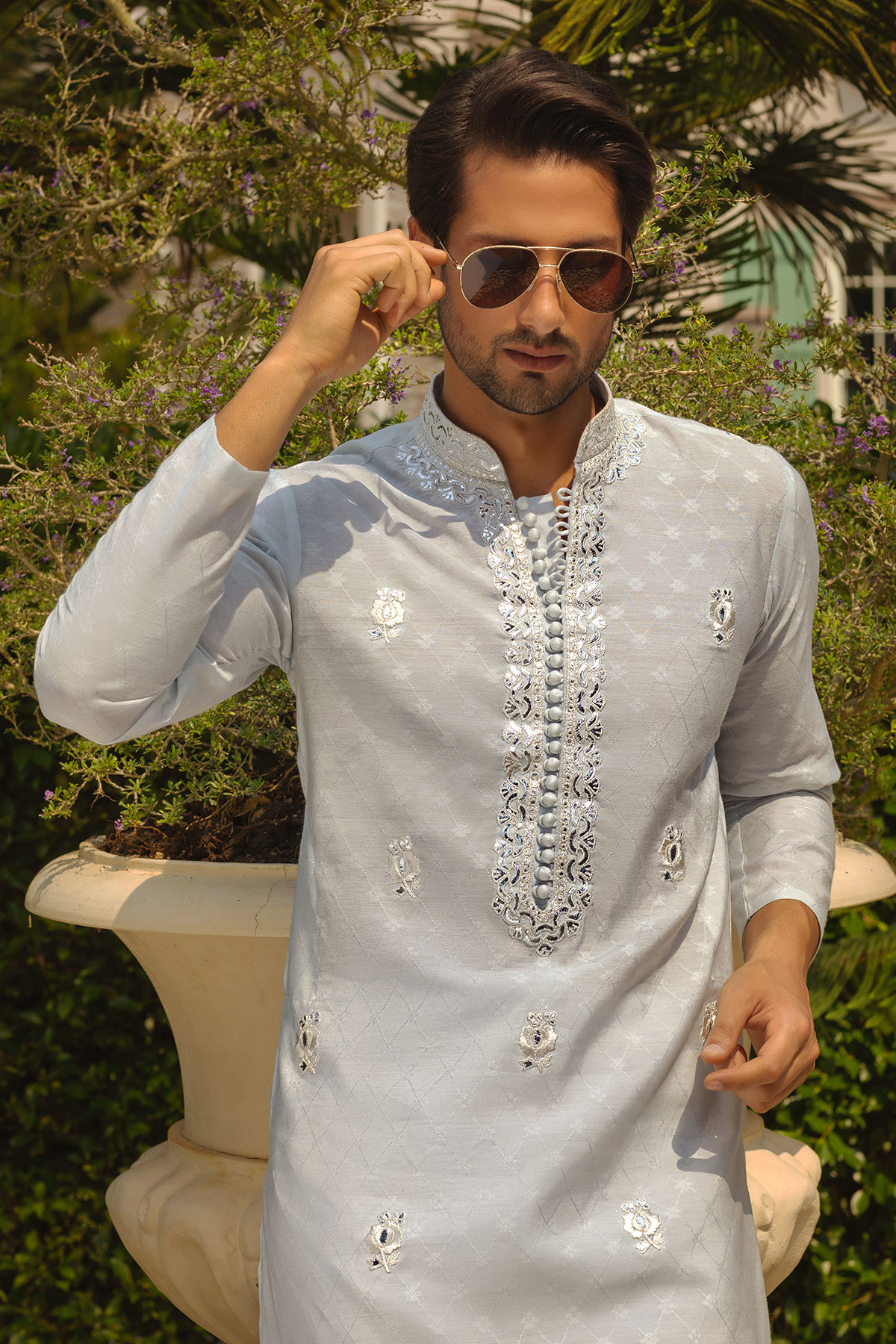 Rendered in dreamy blue Harim features intricate tone- on-tone embroideries accentuated with a hint of silver. The self-patterned canvas is rendered with silk thread floral motifs. The ensemble is completed with a straight cotton pants to create a festive look.