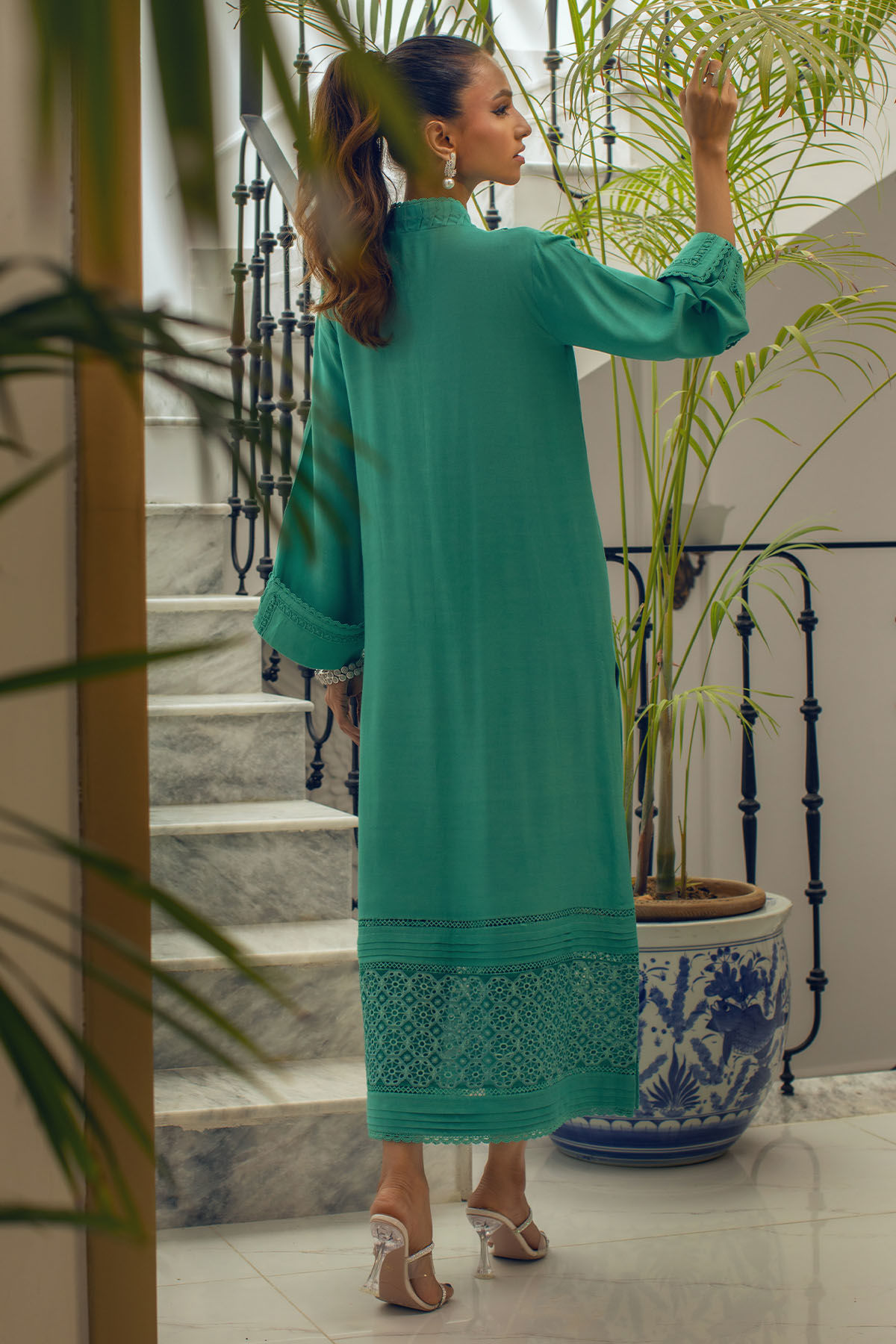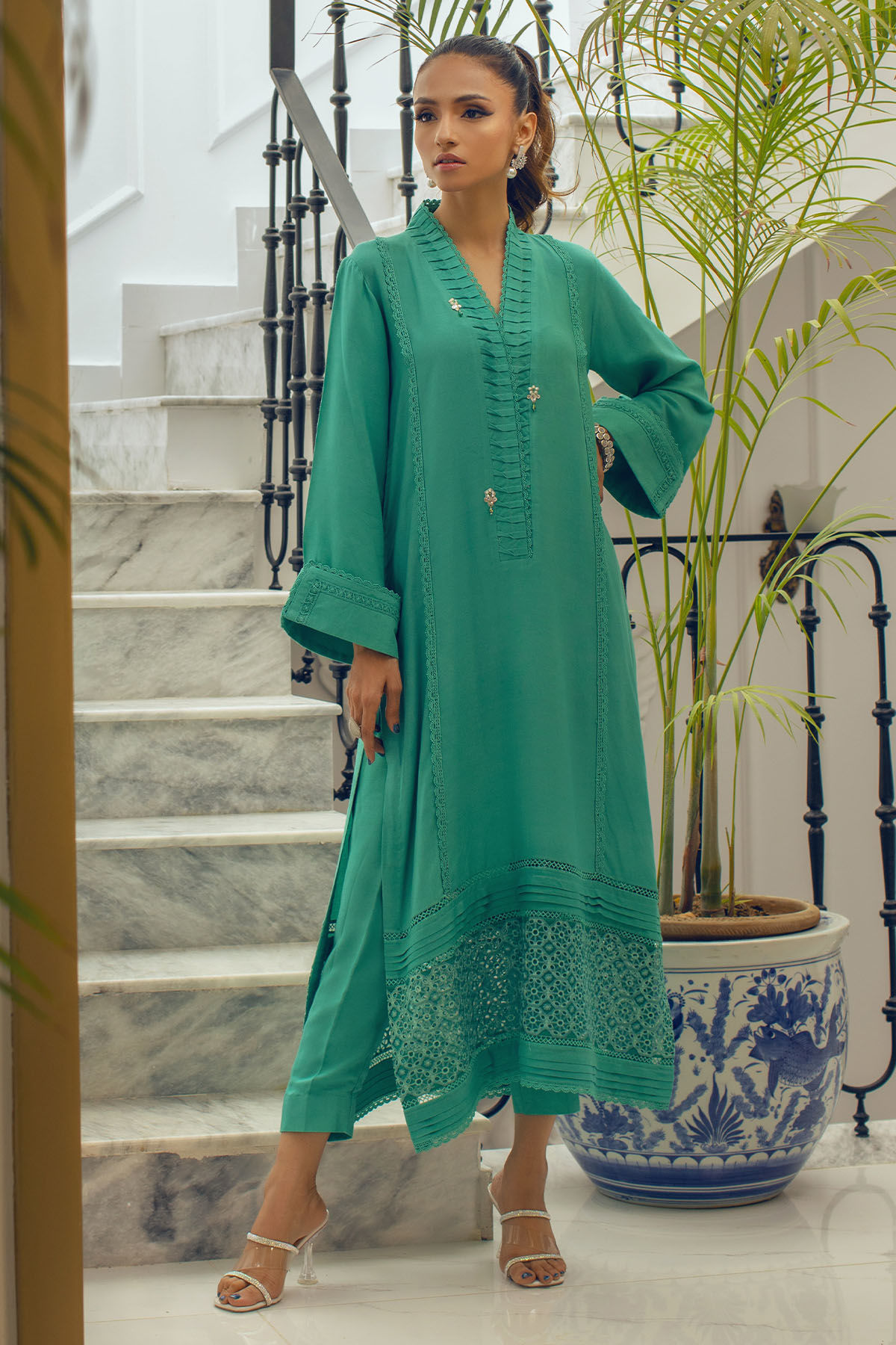 Long silhouette shirt on cotton net canvas in subtle green shade featuring schiffli panel on hemline adorned with pleats details. The neckline is enhanced with fabric manipulation details and is set to perfection with light catching crystals. The shirt is paired with matching cotton net pants.