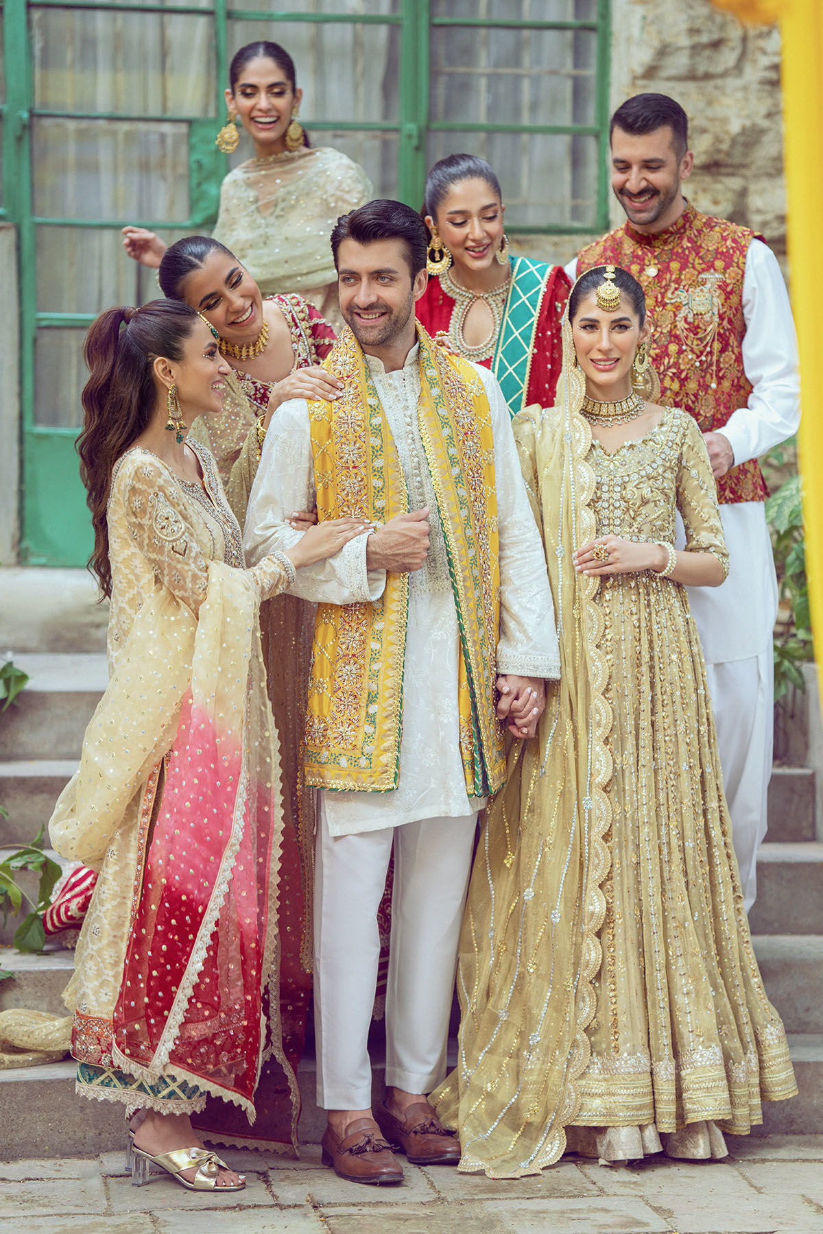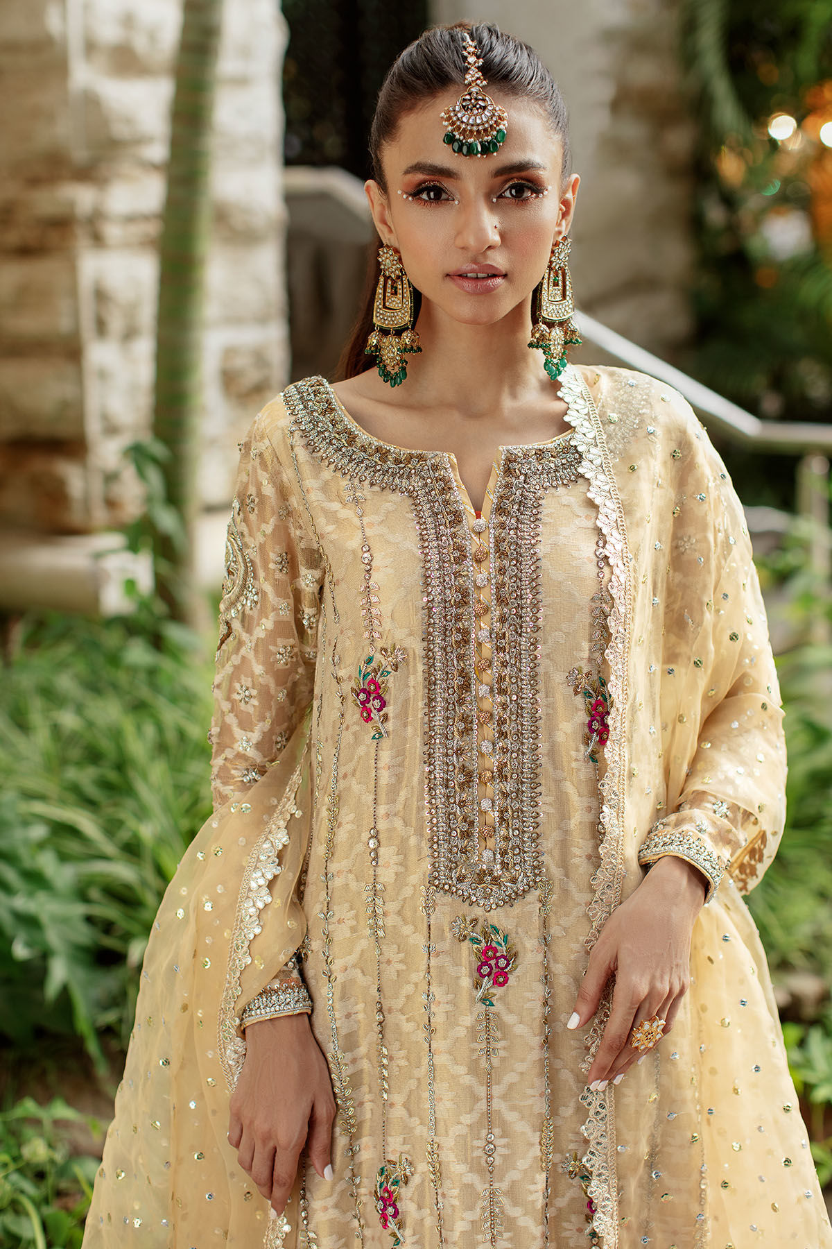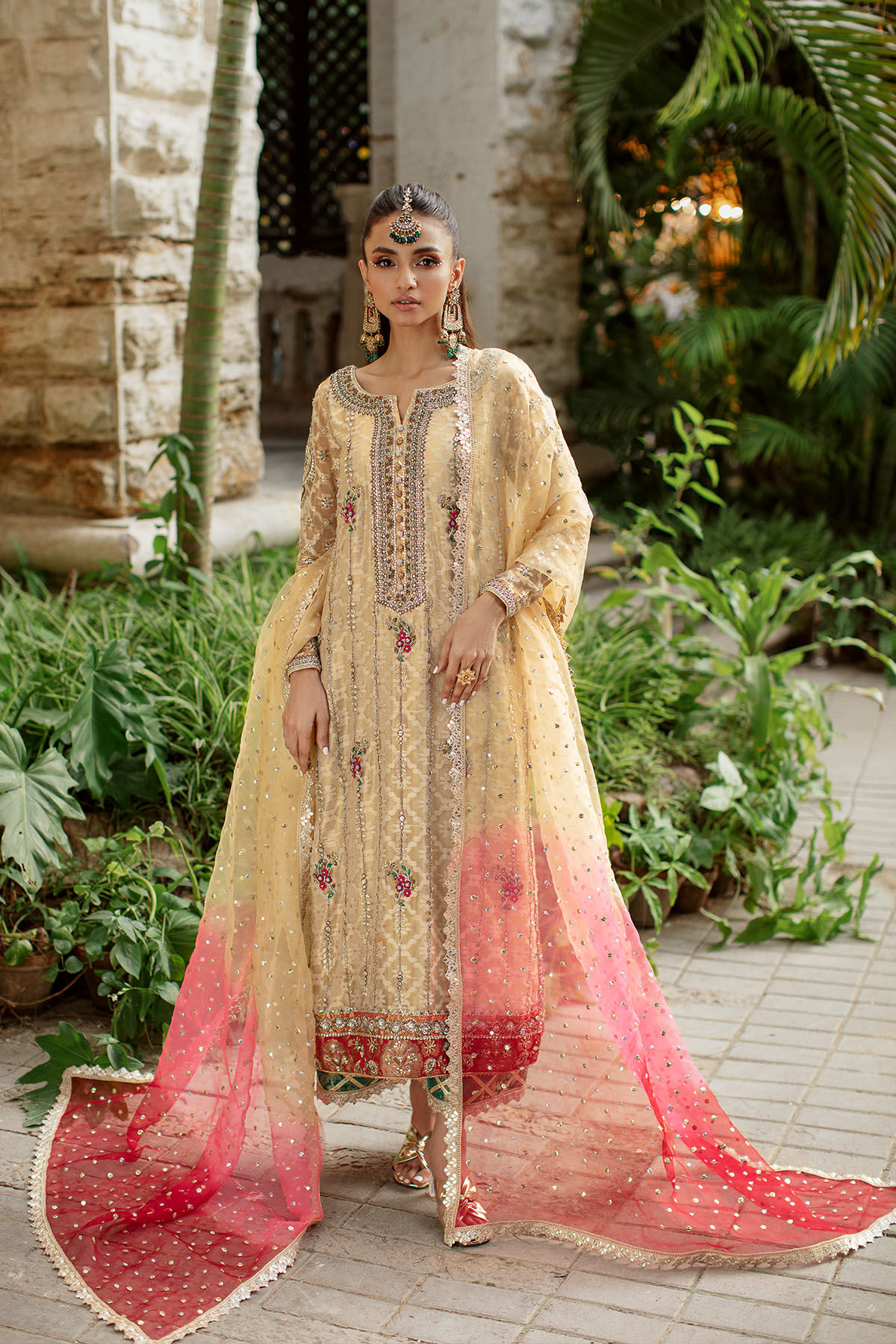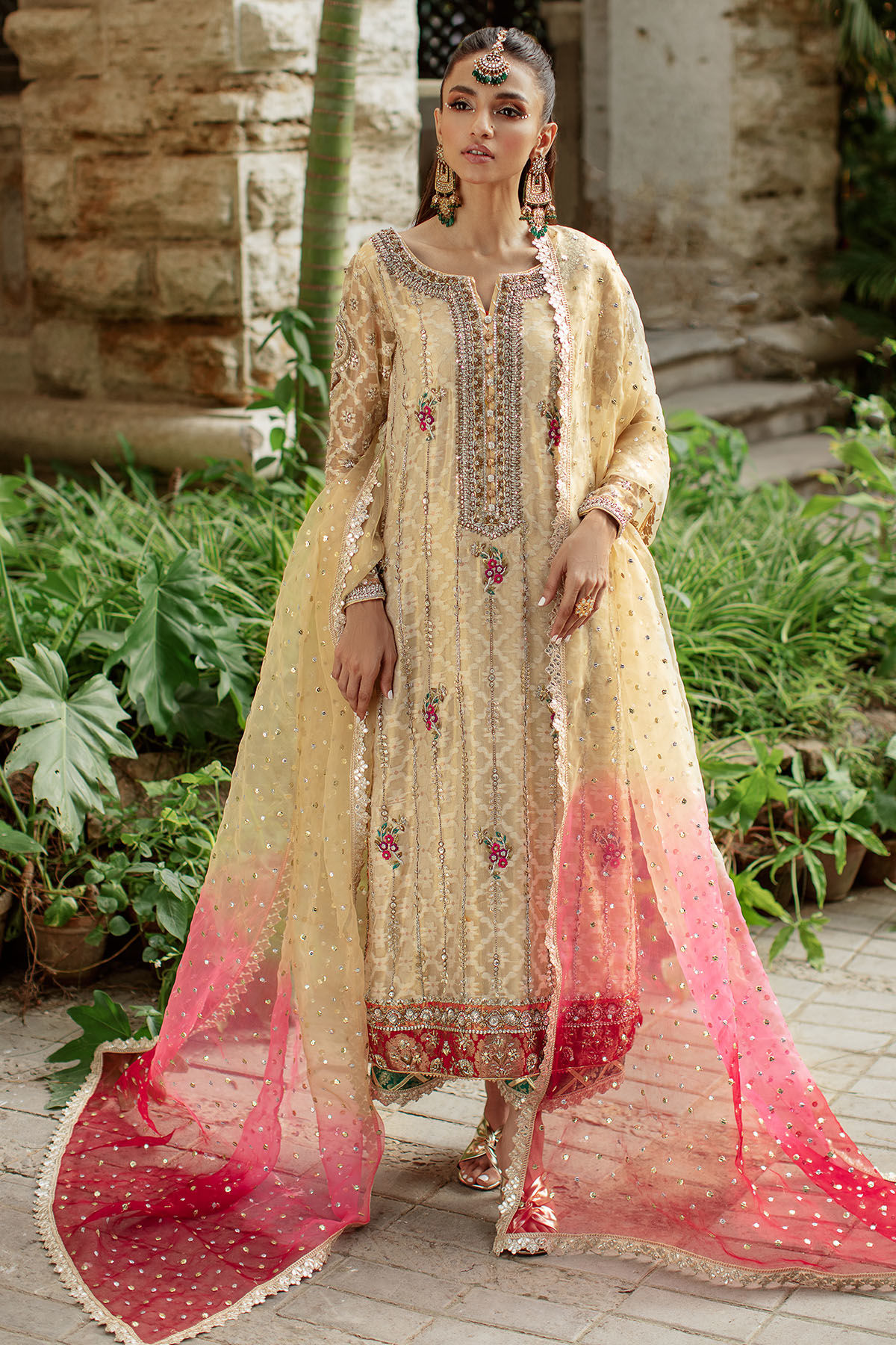 Long silhouette shirt in metallic gold embossed zari canvas featuring gorgeous details of antique and gold zardozi on neckline. The shirt is adorned with gorgeous silk thread embroidered rosettes on centre front which are accentuated with gota and nakshi details. The shirt is paired with izaar featuring contrasting hemline and lace finishings. The outfit can be paired with pure organza ombre dupatta with heavy sequins details and lace finishings.