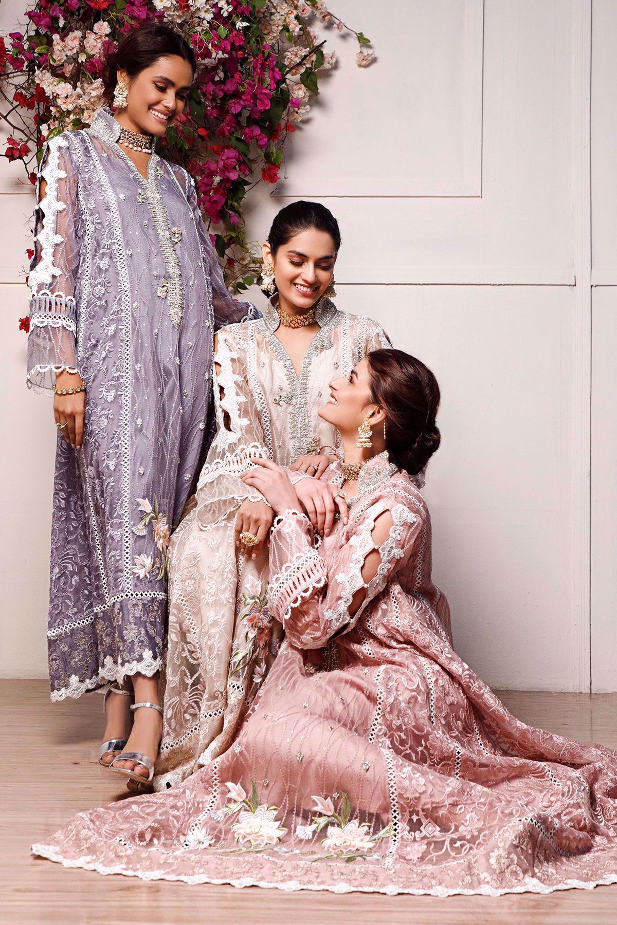 An amalgamation of different patterns of embroidered organza merged together to create this head turning flair of seven yards. The embroidered panels are sewn together with crochet insertion laces. The hemline has embroidered details of silk thread roses. The neckline is made of pearls, crystals and embroidered rosettes. The pishwas comes with matching net and organza dupatta with pearls and sequins. Pishwas is paired with raw silk straight pants.