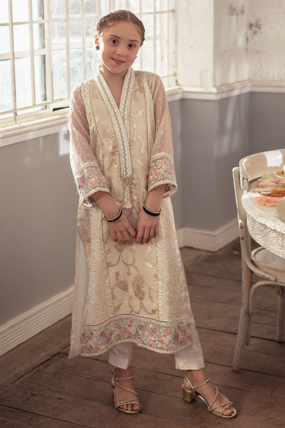 An elongated A-line shirt in pristine white, subtly highlighted with hints of gold, features a lustrous Lurex panel at the center front . The sleeves are crafted in shimmering Lurex, adding a contemporary contrast to the silhouette. Intricate hand block–printed detailing further enhances the side panels, while the neckline is enriched with delicate gota work, handcrafted zardozi And pearl embellishments. The hem and sleeves are finished with refined embroidered borders. The ensemble is completed with coordinated straight pants and an ombre chiffon dupatta, adorned with hand block–printed details and finished with a touch of shimmering gota.