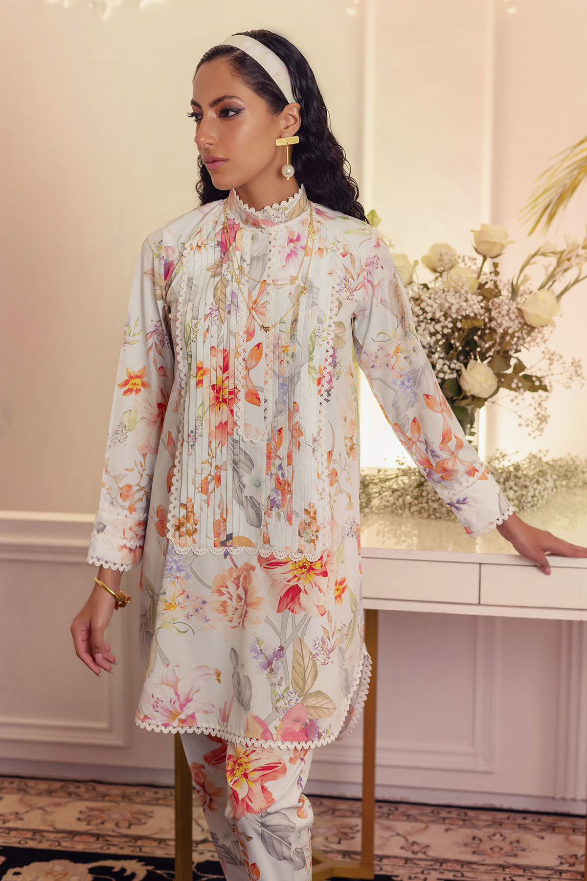 High low pleated floral co-ord set featuring beautiful lyrical symphony of Hydrangeas and Lilies. The neckline of the shirt is adorned with lace and pleated details. The printed shalwar is sure to set you apart.