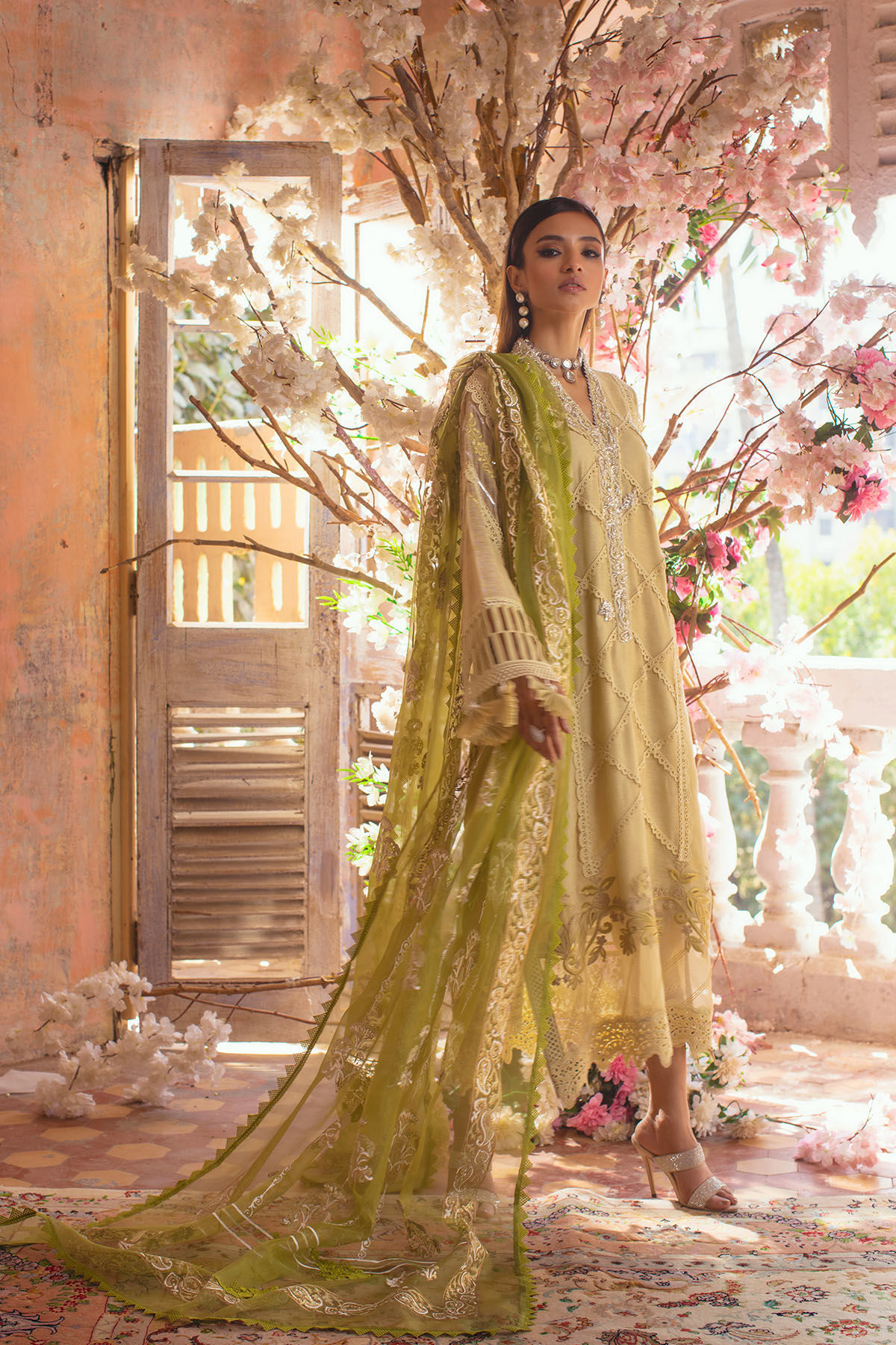 Long silhouette A line shirt featuring handcrafted zardozi neckline. The center front is adorned with laces and resham embroidered on organza appliqué panel in subtle shades of corals and peaches. The sleeves are adorned with fabric manipulation details along with resham embroidery and gota details. The hanging handcrafted tassels on the sleeves hem are sure to set you apart. The outfit is paired with a contrasting hand block printed dupatta in shade of citrus green which is finished with matching crochet laces. The shirt is paired with signature AA pants featuring organza and lace details on hemline.