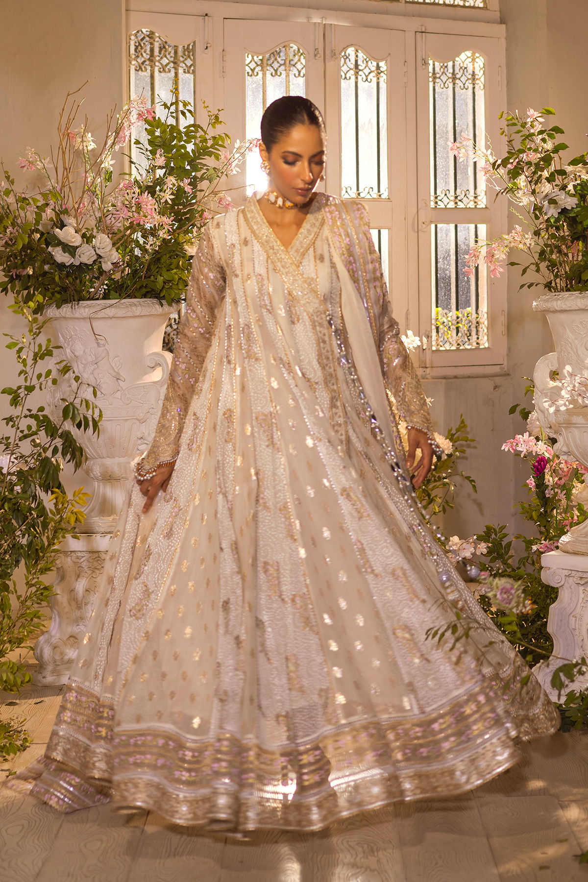 Old school angharka on chiffon canvas featuring hand block printed and gota details on each panel. The neckline is adorned with zari embroidered details. The fitted sleeves are enhanced with paisley appliqué motif which is further adorned with dangling pearls and crystal. The angharka can be paired with matching chiffon dupatta featuring block print and gota details. Pair it with matching raw silk pants to complete the look.