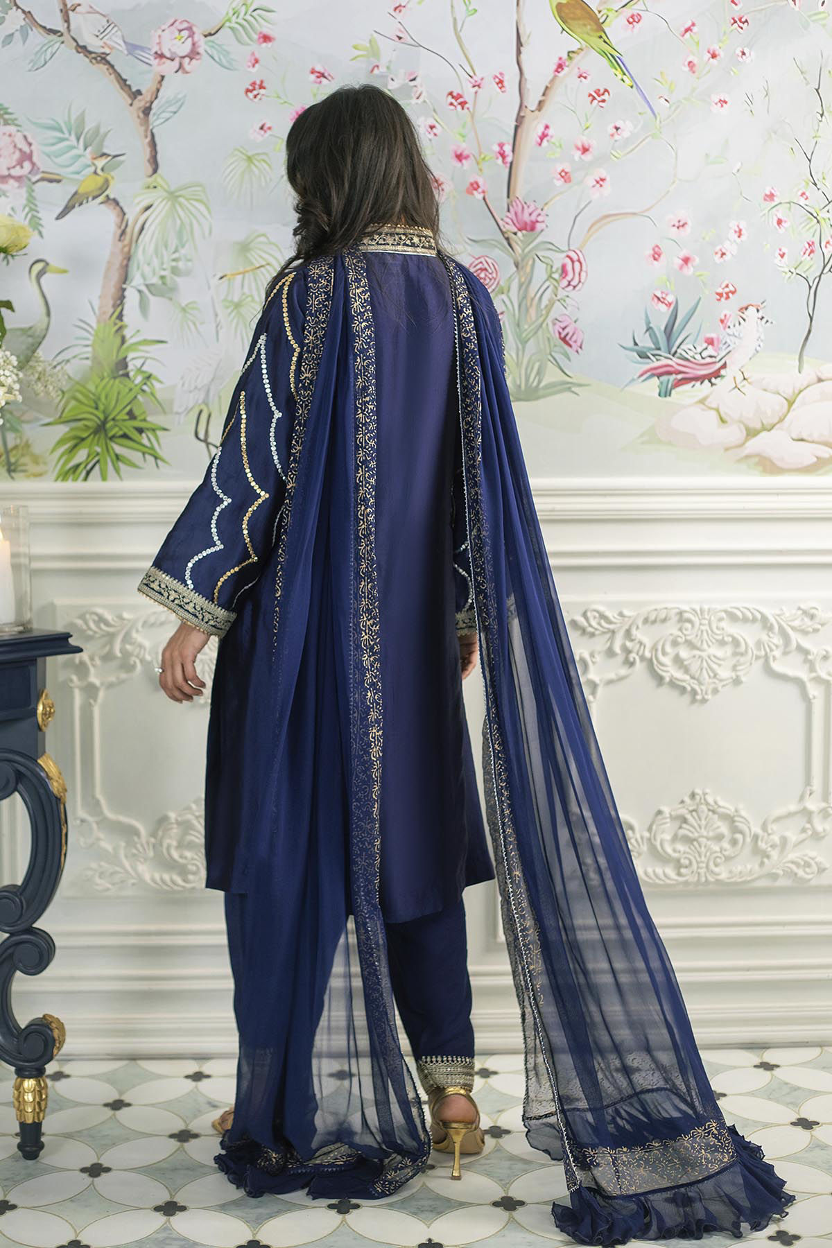 Knee-length shirt crafted from pure silk in deepest shade of navy, featuring an intricately zari-embroidered neckline. The center front is embellished with abstract sequin details. Accompanied by a complimentary chiffon dupatta showcasing block-printed borders and ruffle accents on each pallu. The ensemble is completed with a khari shalwar, providing a cohesive and elegant appearance.