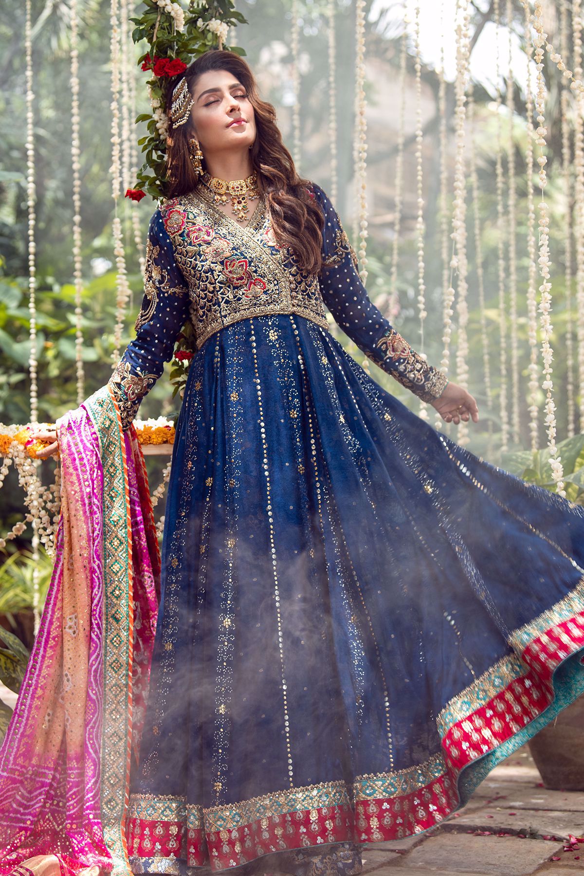 An ode to tradition, a silk net kalidar with old school kaamdani details enhanced with hand block printed borders on hem in multicolored incorporated with old school gota and hand embroidered details. The bodice is intricately handcrafted with silk thread rosettes details which are further enhanced with antique dabka and gota. The pishwas is layered over a jamawar dhaka and paired with a gorgeous chunri dupatta varying hues of pink and burnt orange with hand block printed borders and heavily embellished kaamdani details.