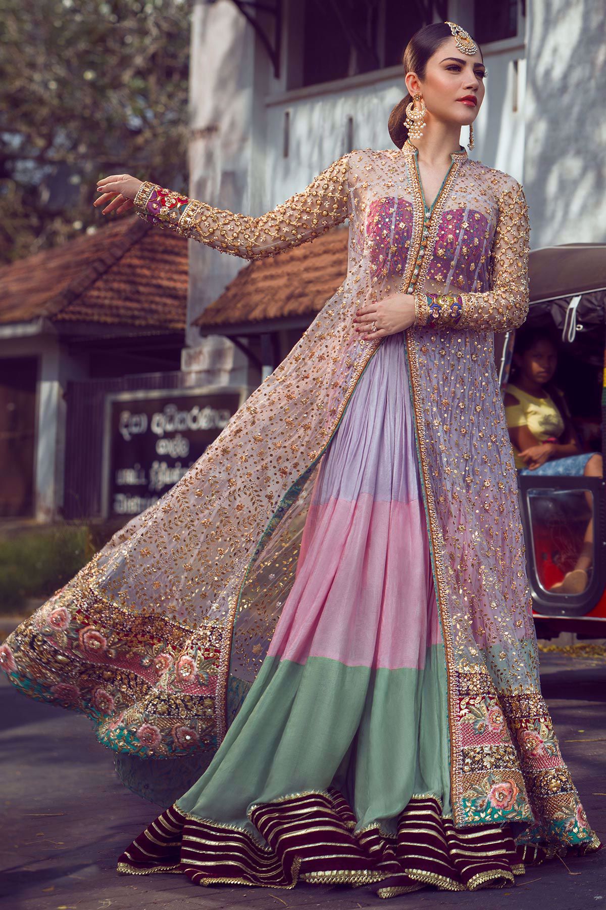 Long silhouette flared paneled ensemble featuring old school inspired kaamdani details along with dabka kora and naqshi. The sleeves of the shirt is heavily hand embroidered with dabka and gota. The hemline has myriad of colorful appliqué details which are enhanced with silk thread rosettes. Paneled dhaka pajama with gathers and velvet details on hemline and dupatta to complete the look.