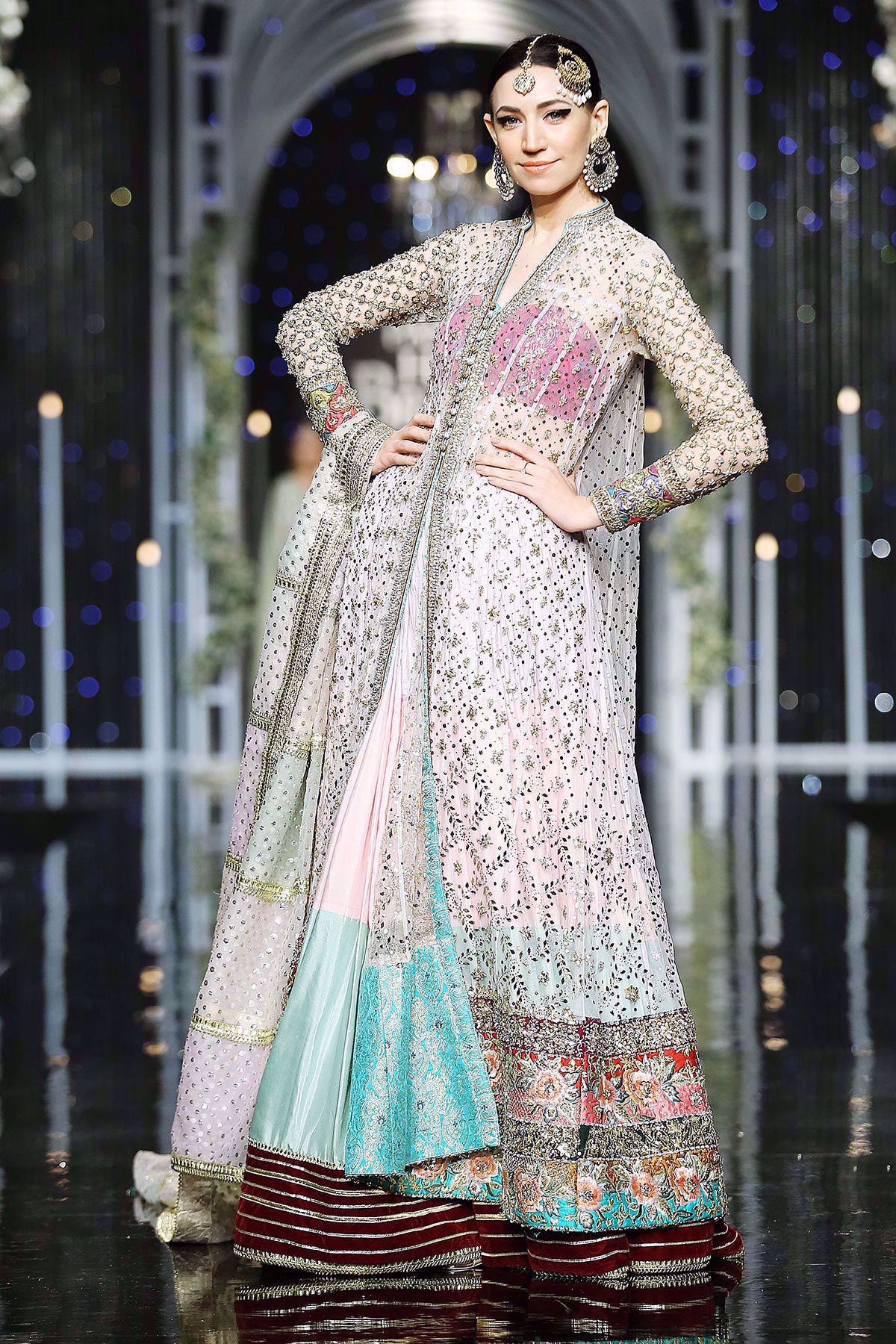 Long silhouette flared paneled ensemble featuring old school inspired kaamdani details along with dabka kora and naqshi. The sleeves of the shirt is heavily hand embroidered with dabka and gota. The hemline has myriad of colorful appliqué details which are enhanced with silk thread rosettes. Paneled dhaka pajama with gathers and velvet details on hemline to complete the look.