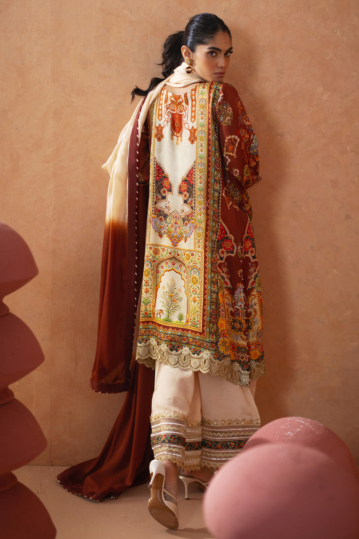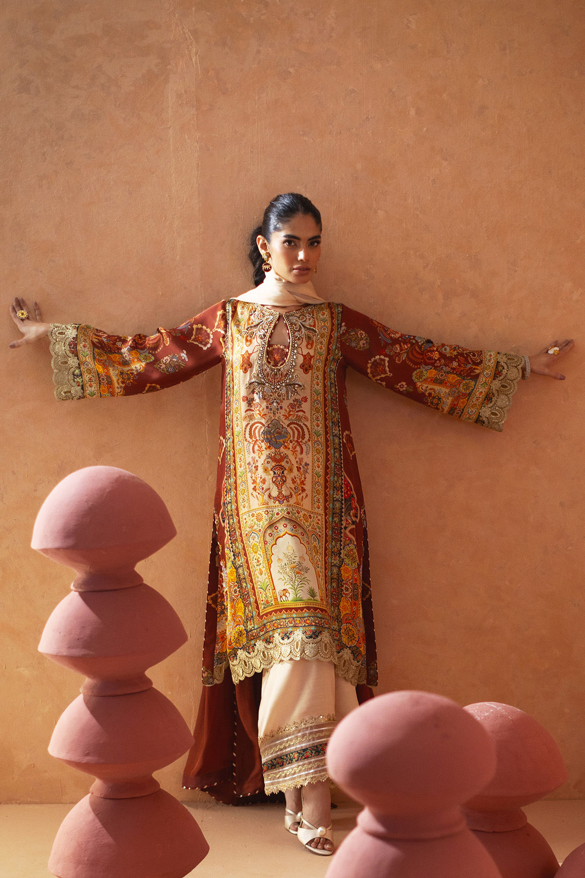 Knee-length shirt crafted in earthy tones on silk canvas, embellished with a traditional Hyderabadi neckline featuring a contemporary twist. The hem is accentuated with intricate zari appliqué details, and the shirt can be complemented with an izaar that showcases exquisite gota detailing. This ensemble is further enhanced by an ombré silk dupatta, designed to make a striking impression this festive season.