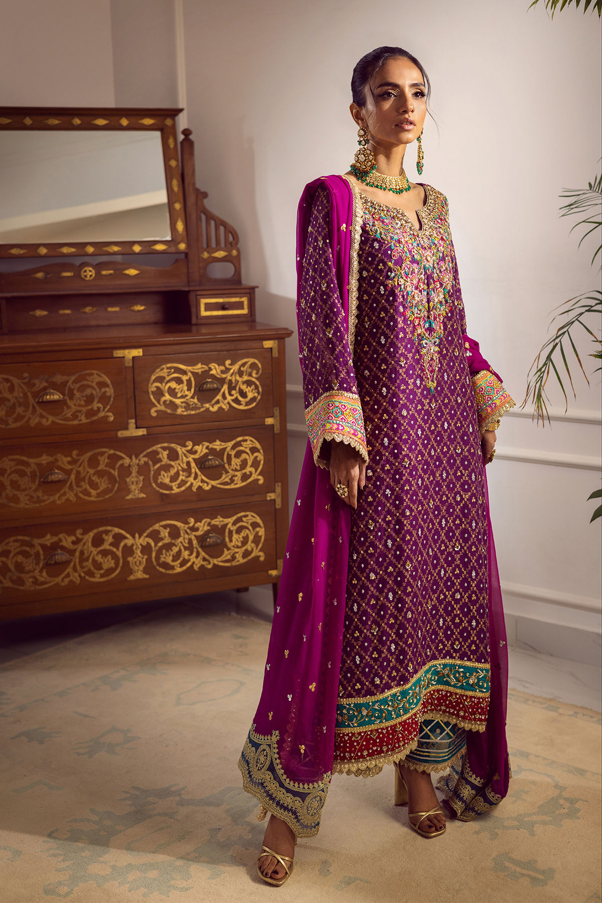 Long silhouette shirt crafted from zari silk net canvas, showcasing an array of silk thread rosettes embellished with intricate zardozi detailing. The hem is accentuated with color-blocked panels, and the ensemble comes with complemented emerald green izaar, featuring block print and gota embellishments. Additionally, the shirt may be paired with a chiffon dupatta, adorned with zari appliqué borders and lace finishings.