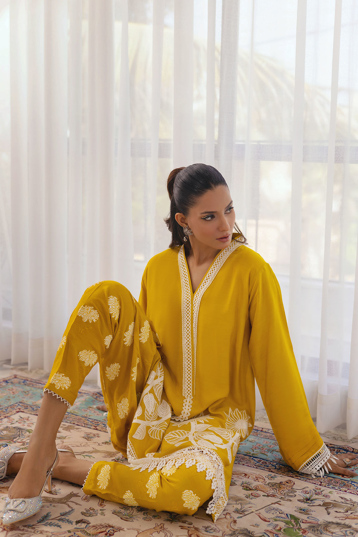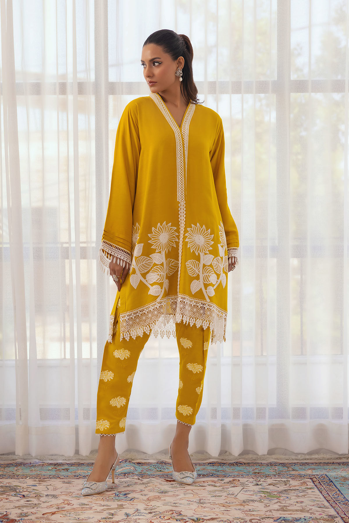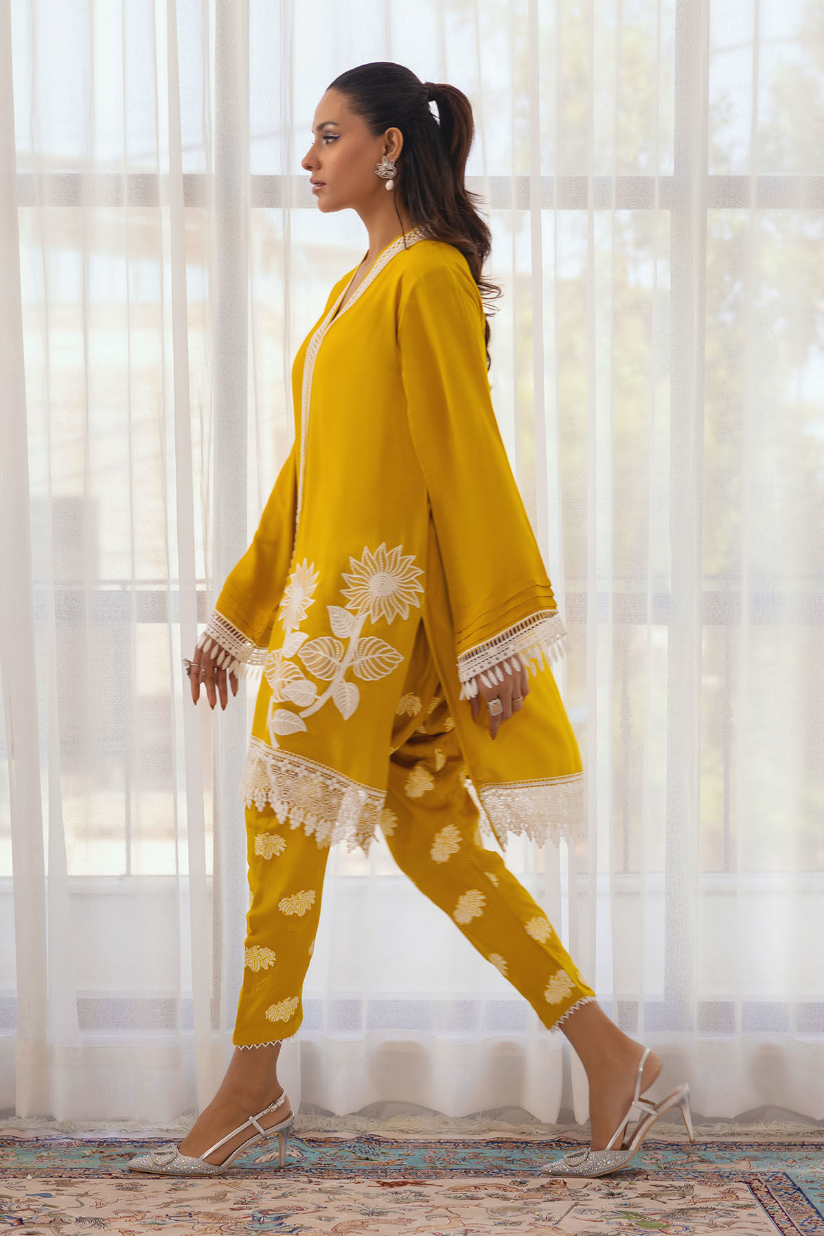Knee length co-ord set in sunflower yellow adorned with sequins and thread embroidered floral appliqué motifs on hemline. The neckline is adorned with lace details and the top comes with block printed straight shalwar.