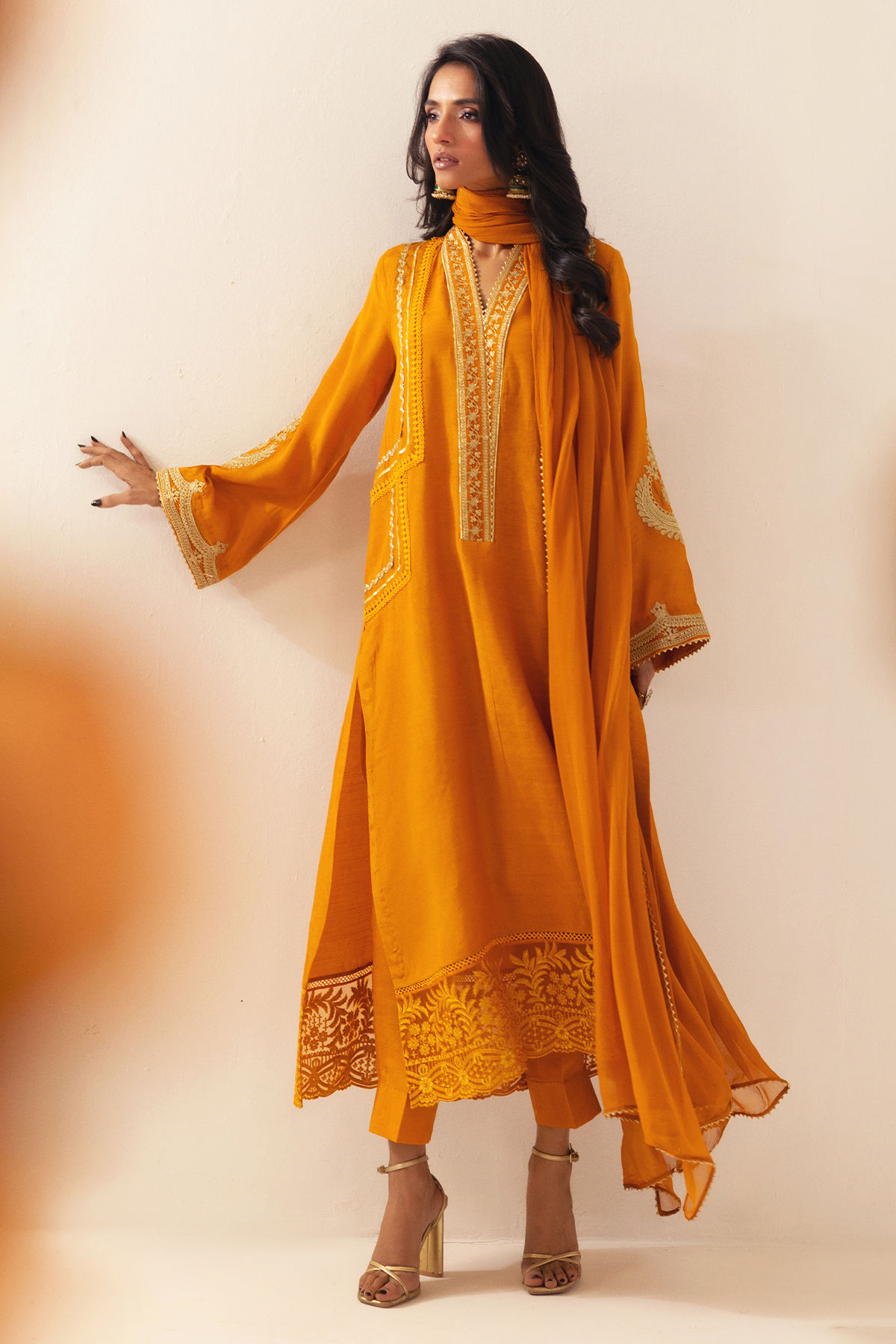 Long silhouette shirt in deep ochre raw silk canvas, embellished with gold aari embroidery on the neckline. The center front is accentuated with gota and lace detailing, while the hem is adorned with an embossed organza panel. The sleeves are enhanced with aari embroidered accents. This ensemble is complemented by matching straight raw silk pants and a chiffon dupatta, creating a complete and sophisticated look