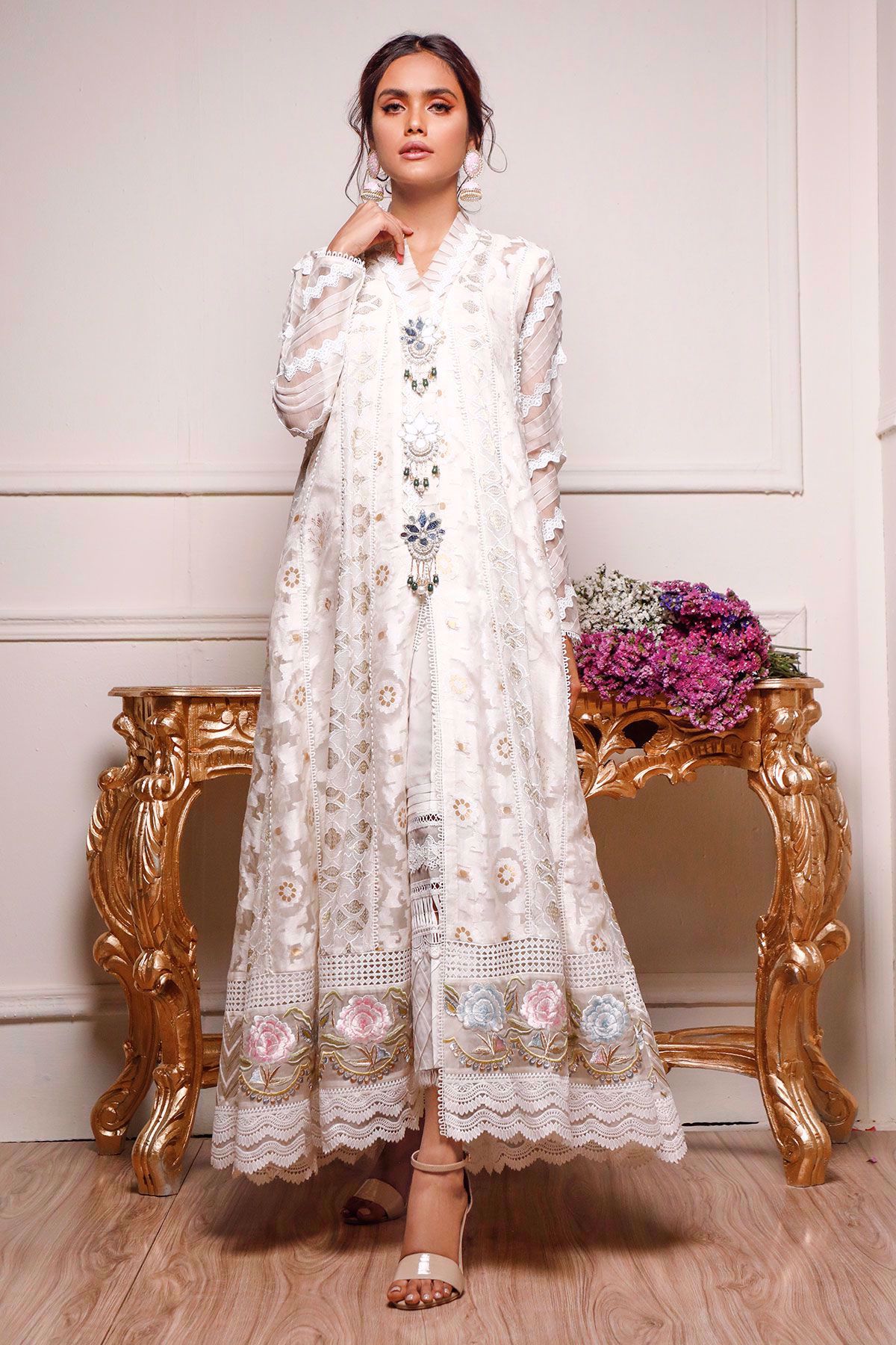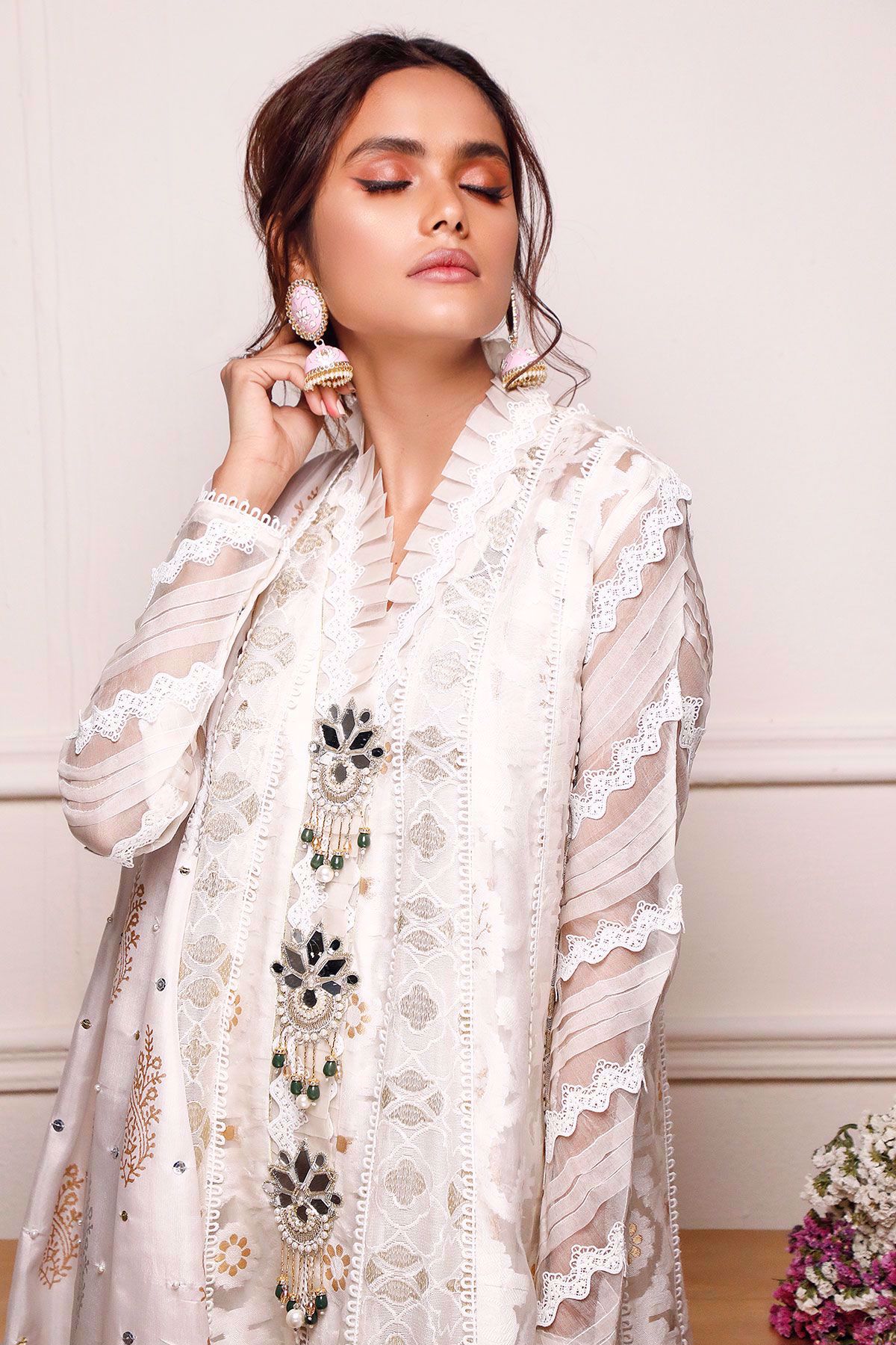 Stunning white Kiran Kalidaar is an amalgamation of different patterns of organza merged together to create dreamy silhouette incorporated with silk thread embroidered roses on the hemline. The hemline is further finished with crochet laces. The organza sleeves are finished with pleated technique along with crochet laces. The neckline is adorned with handcrafted mirror embellished tassels with jade and pearls. The Kalidaar is paired with ombré medium silk dupatta with block printed details incorporated with pearls and sequins. The kalidaar is paired with Afterglow pants featuring pure raw silk pleated details, crochet laces, organza and pearls.