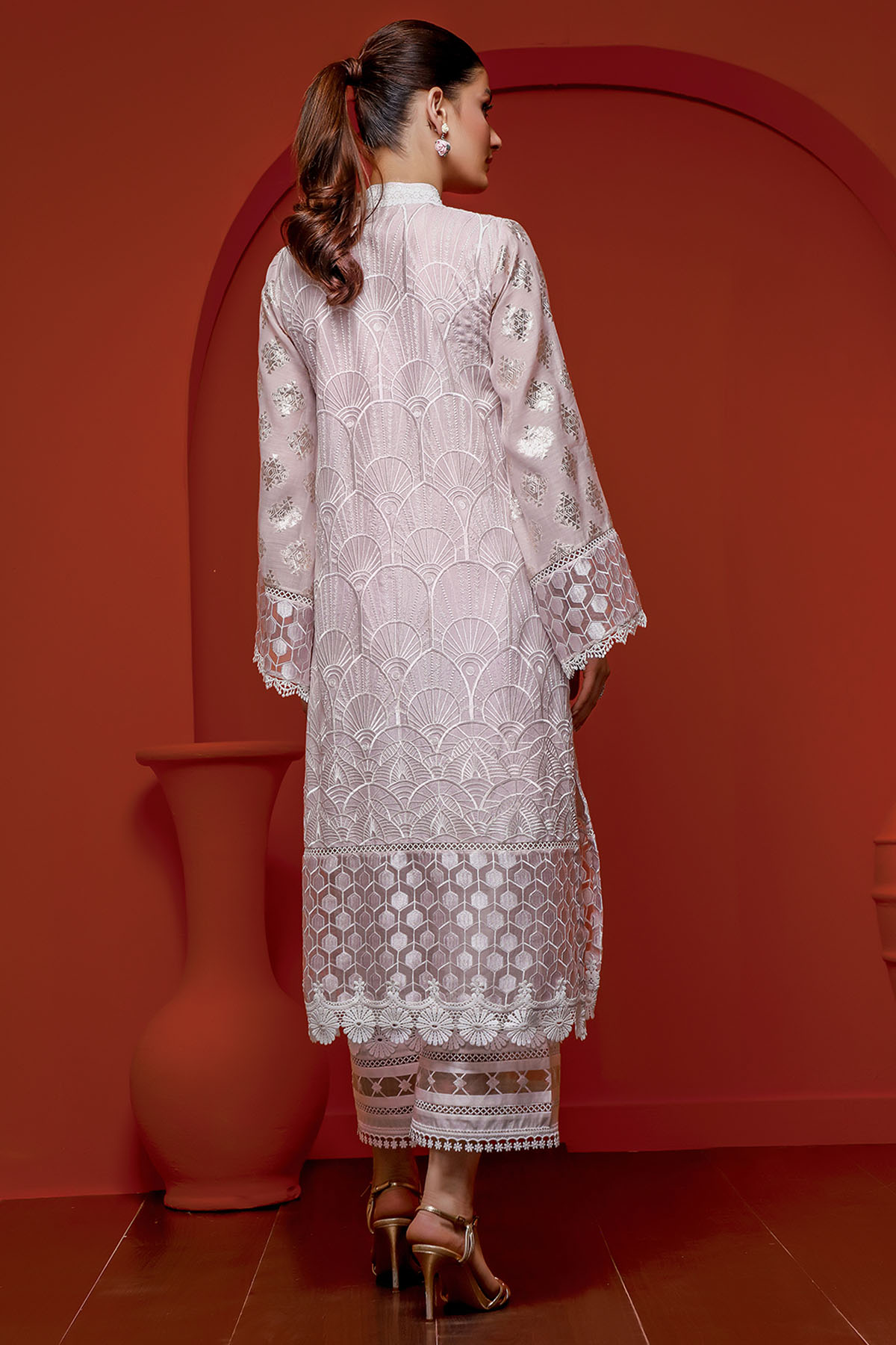 Embroidered raw silk long shirt with organza and lace finishing in dreamy lilac shade, the sleeves are enhanced with gold zari motifs and the neckline is adorned with handcrafted buttons.